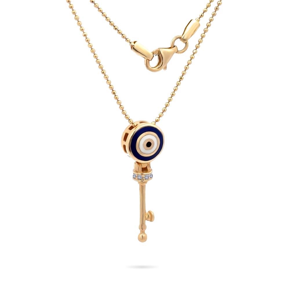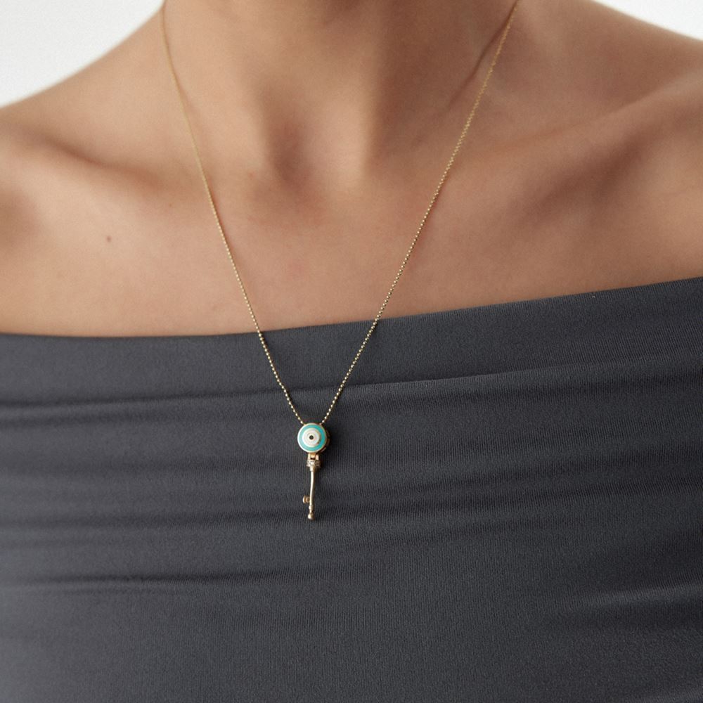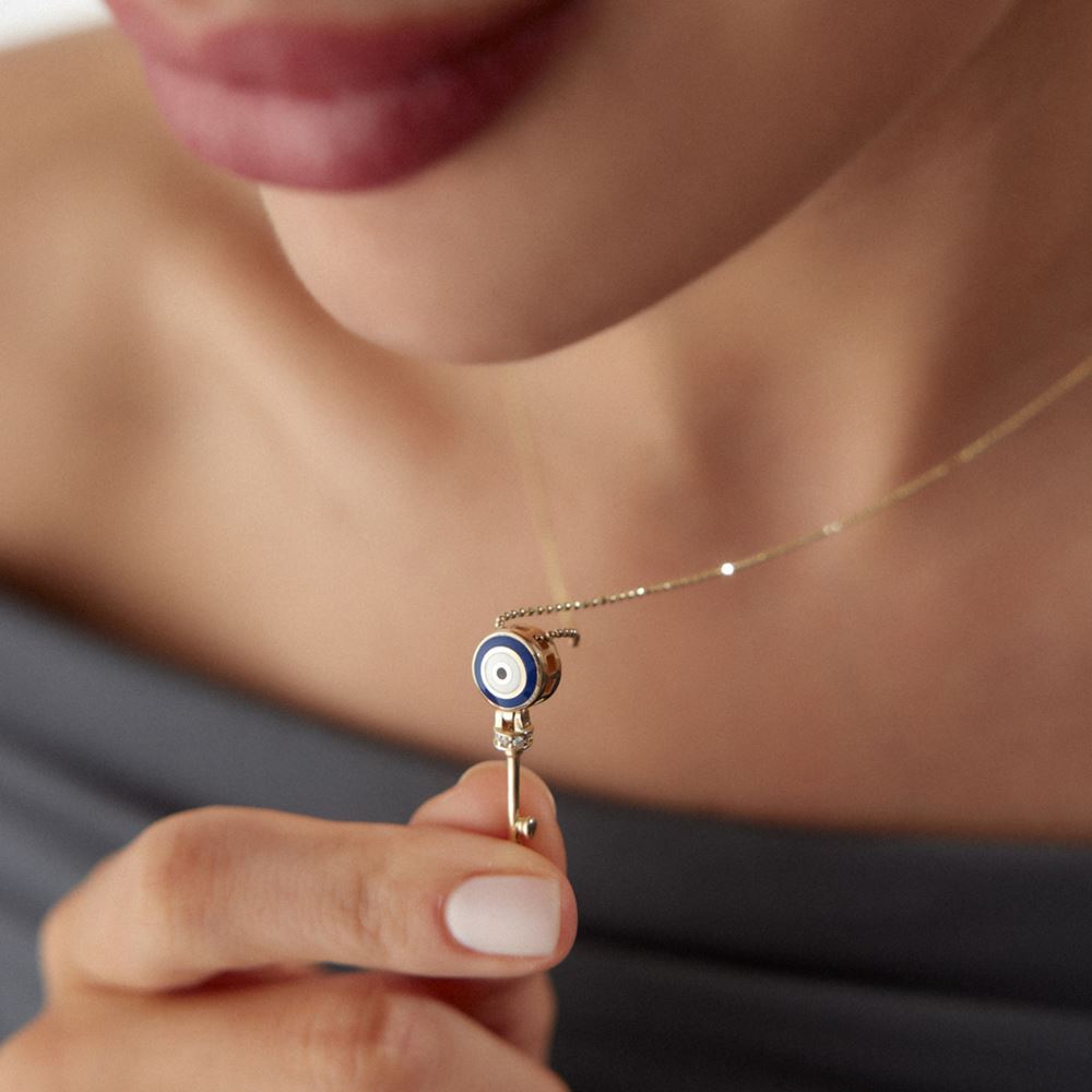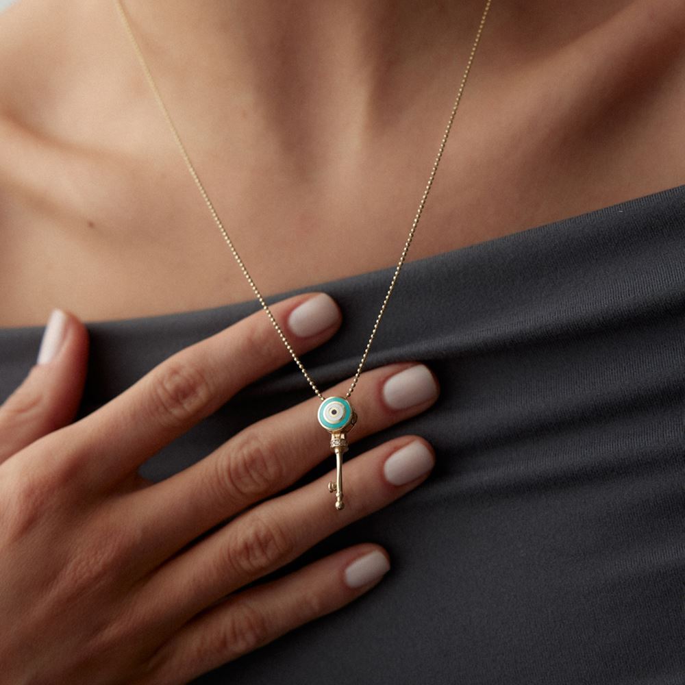Anahtarlı Nazar Mine Kolye: Nazar boncuğu ve anahtar figürlerini bir araya getiren, mineli tasarımıyla göz alıcı bir kolye. Hem koruyucu hem de şık bir aksesuar.