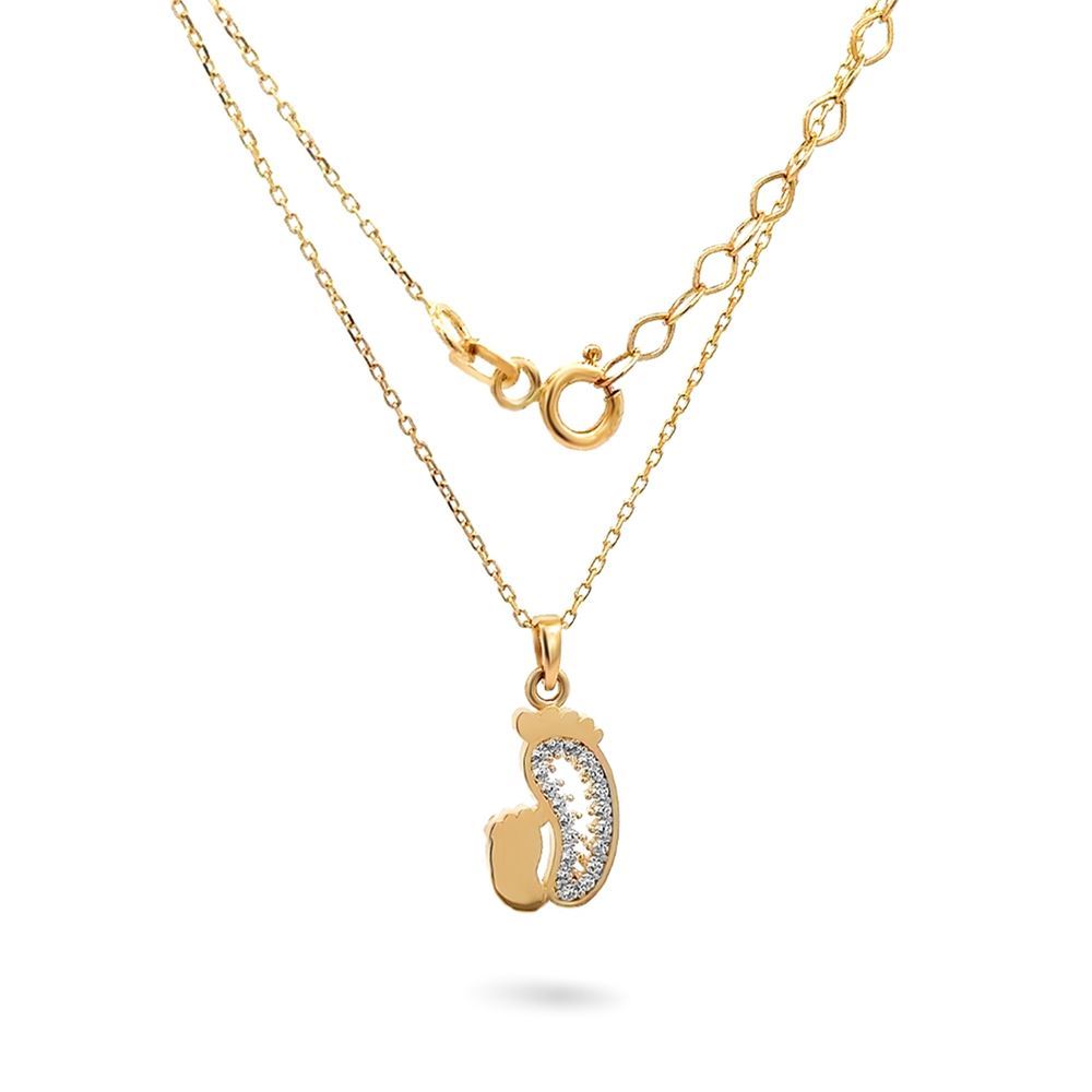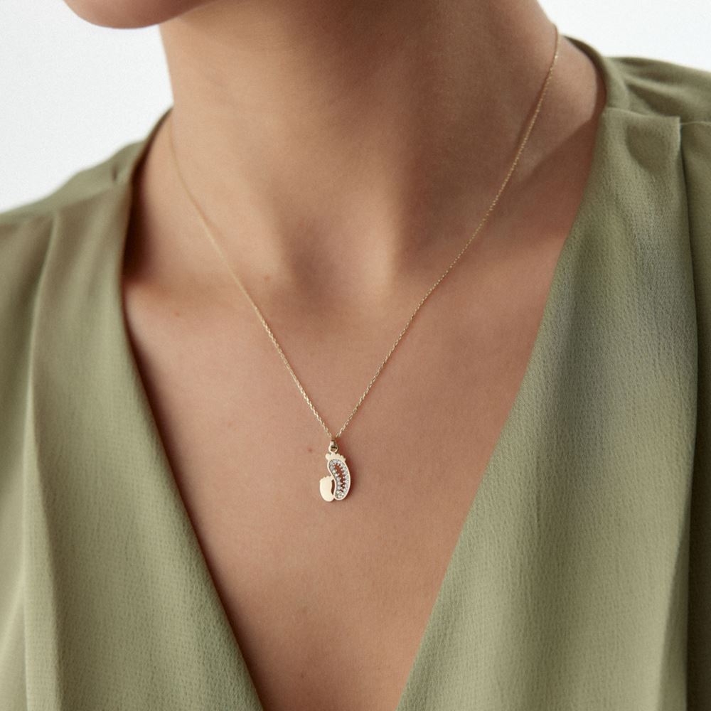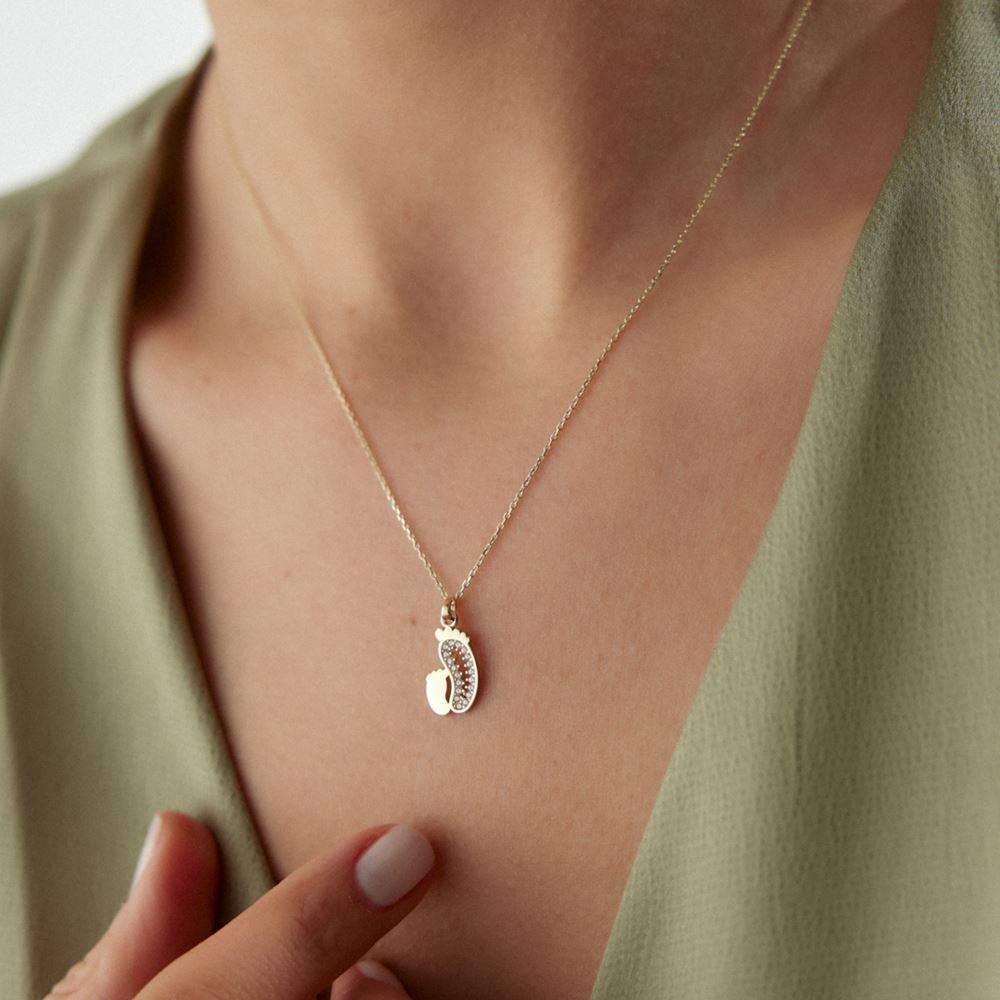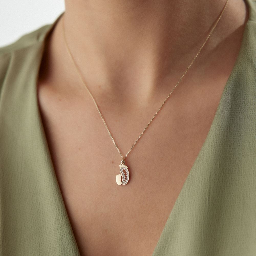 Ayak İzi Taşlı Kolye: Ayak izi motifli taşlı kolye, özgün bir tasarımla dikkat çeker.