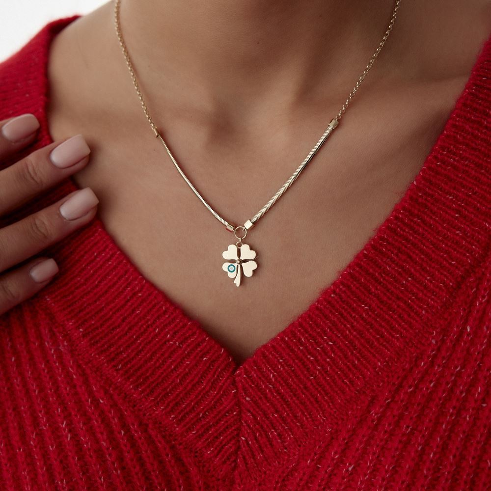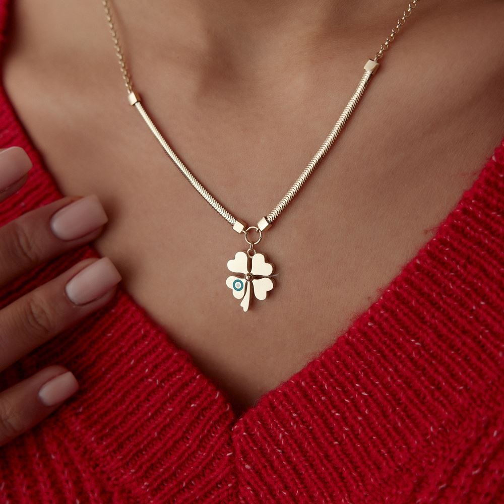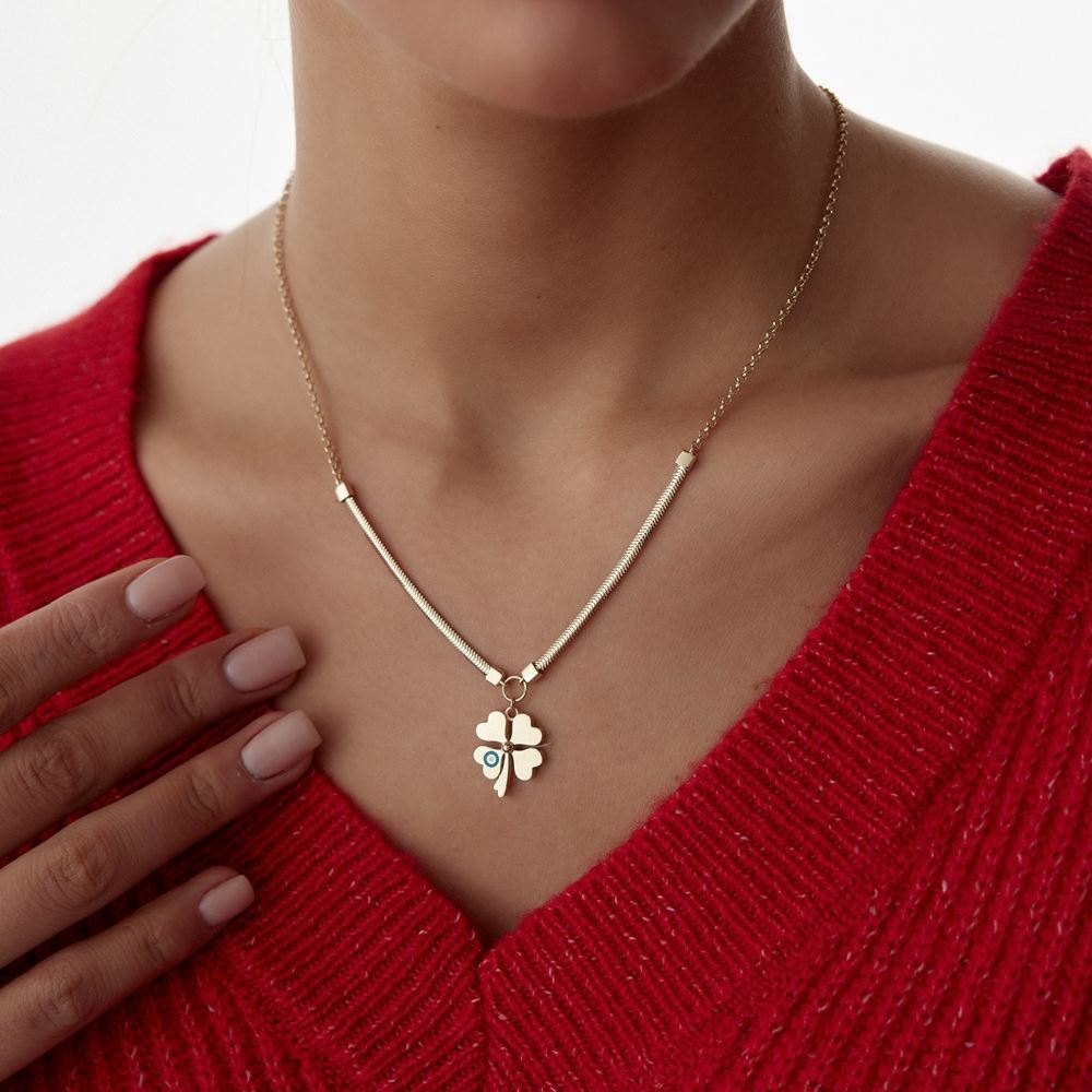 Balıksırtı yonca kolye, şans ve zarafeti buluşturan tasarımıyla E-Goldia Jewellery’de stilinize değer katıyor.