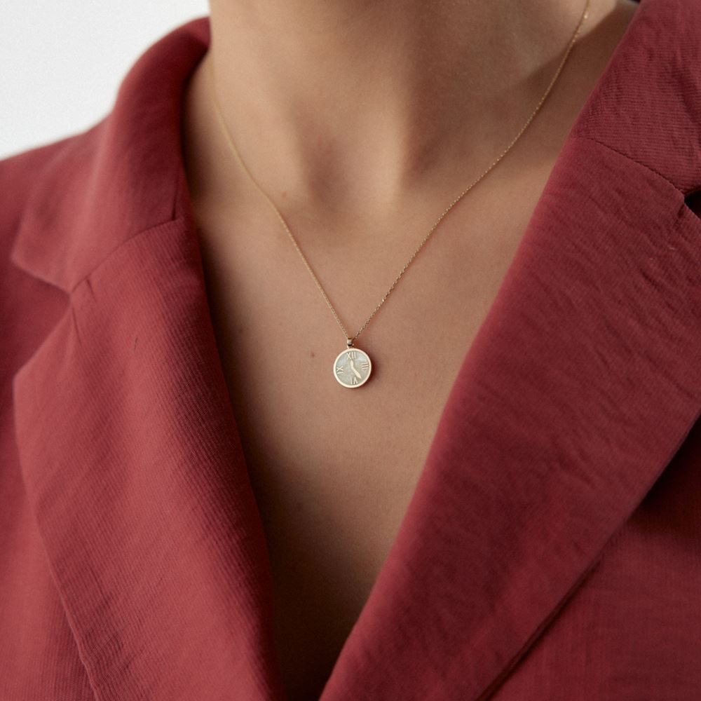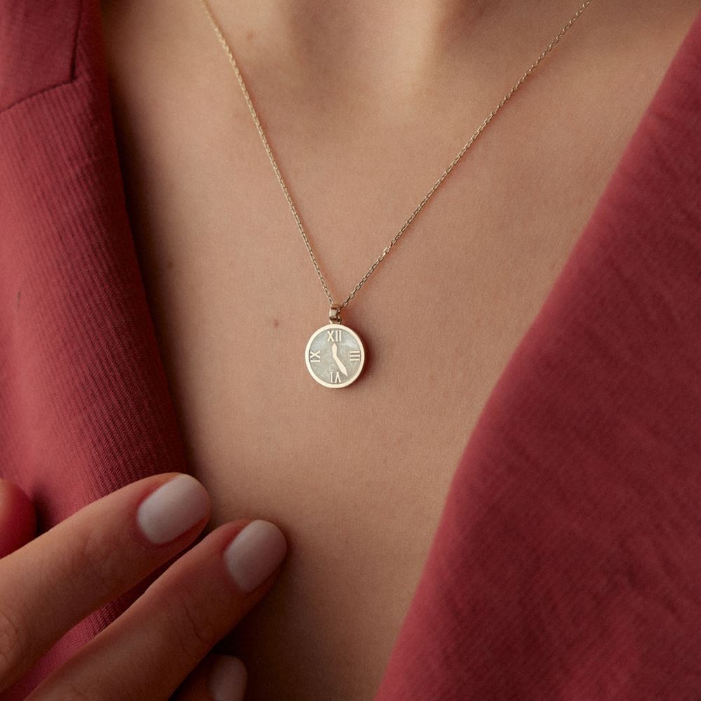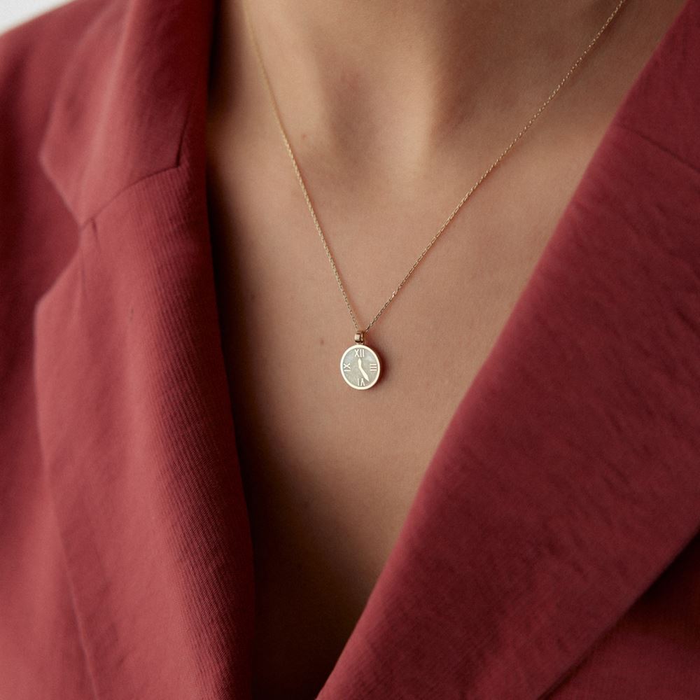 Beyaz Mineli Saat Kolye saat detaylı tasarımıyla şıklığı ve fonksiyonelliği bir arada sunar.