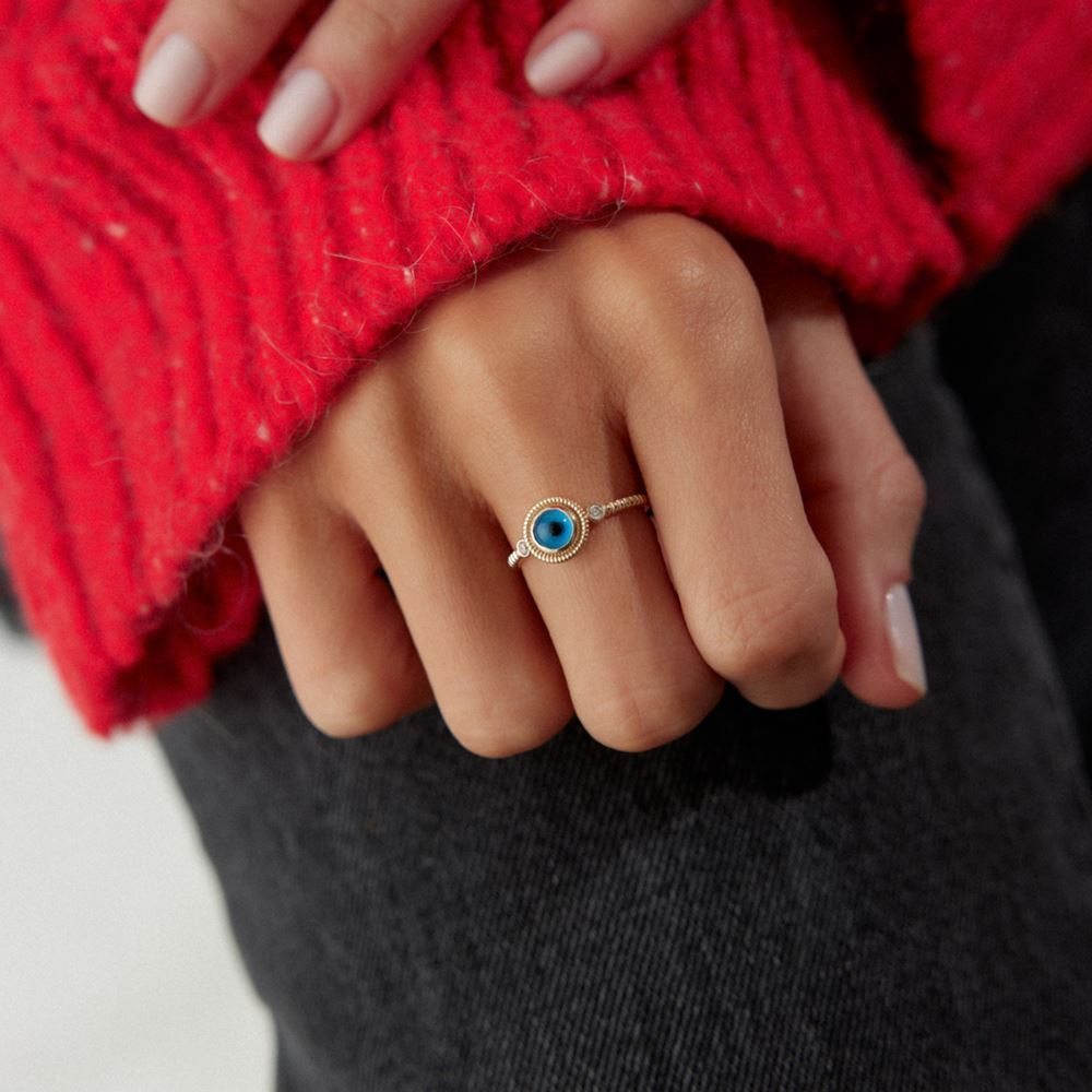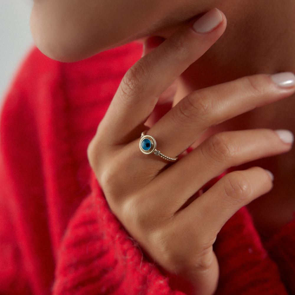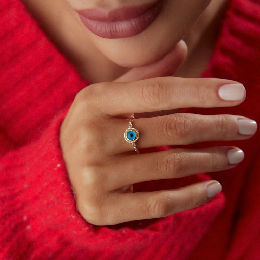 Burgu ve göz tasarımıyla dikkat çeken yüzük, özgün bir görünüm sağlar.