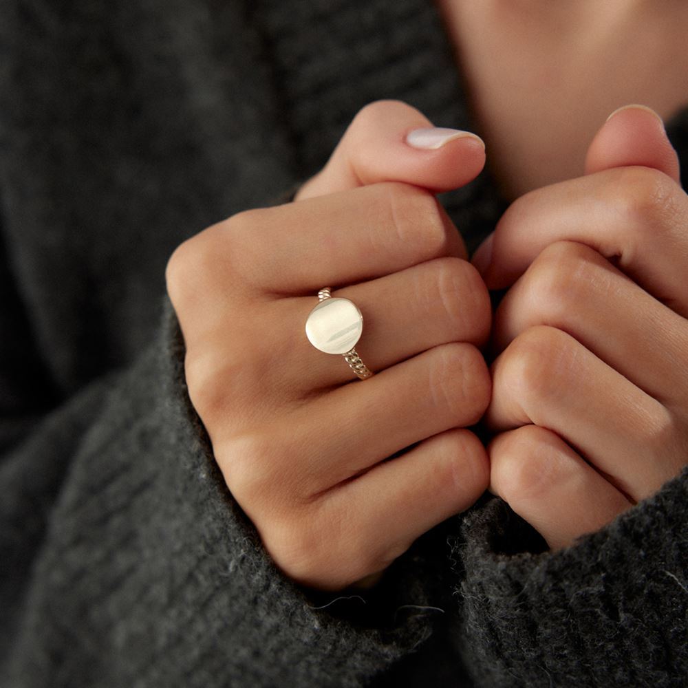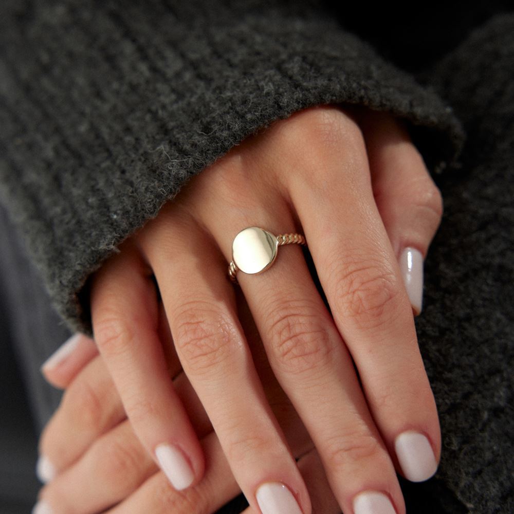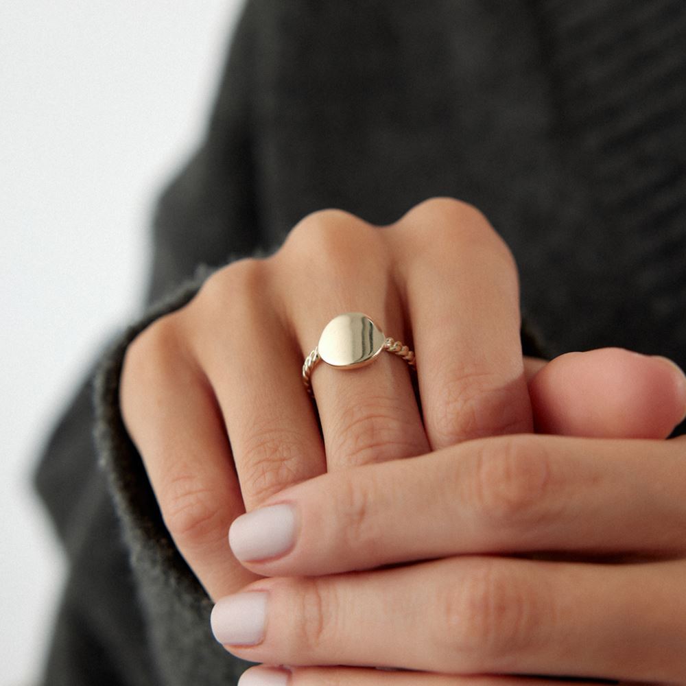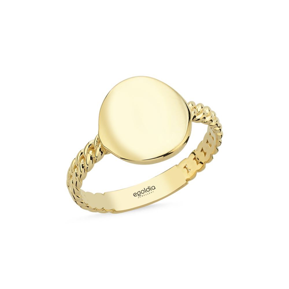 Burgu plaka tasarımıyla süslenen yüzük, özgün ve zarif bir görünüm sağlar.