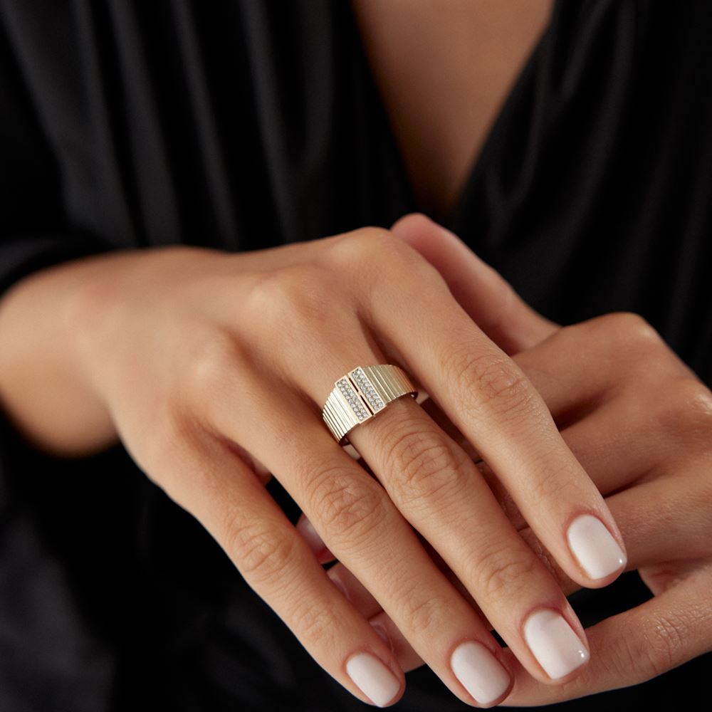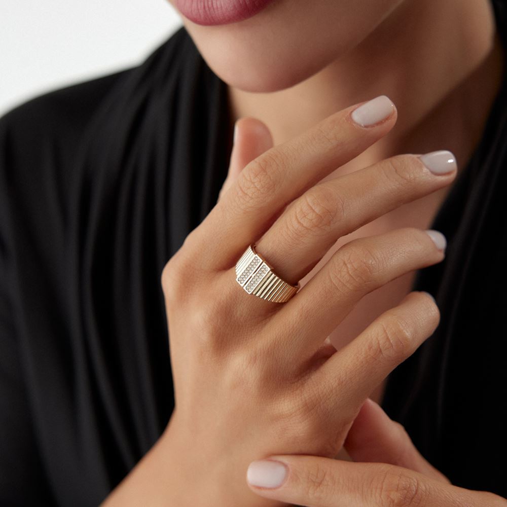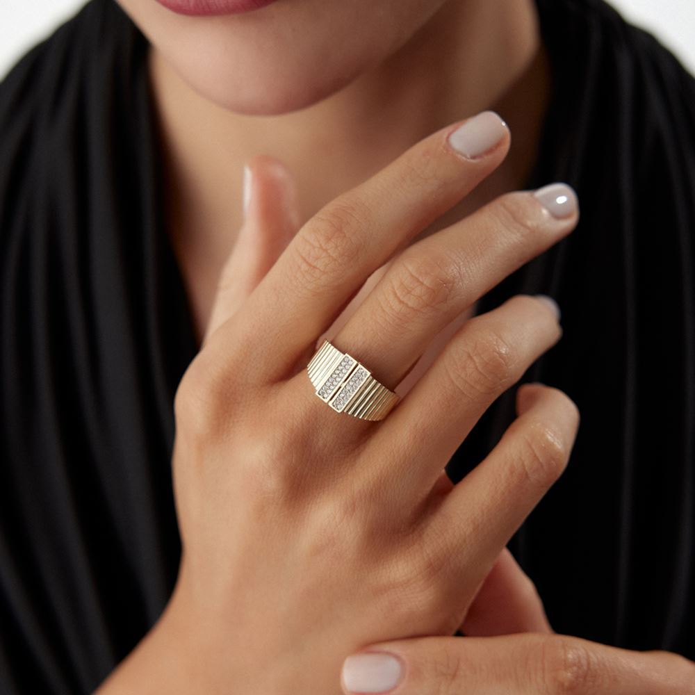 Çift T taşlı yüzük, zarif taşlar ve modern tasarımıyla göz alıcı bir seçimdir. Hem şıklık hem stil arayanlara hitap eder.