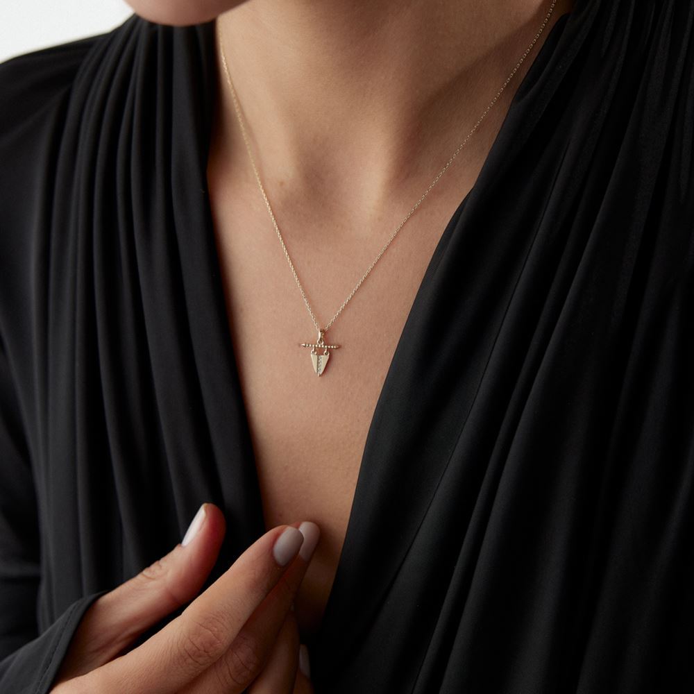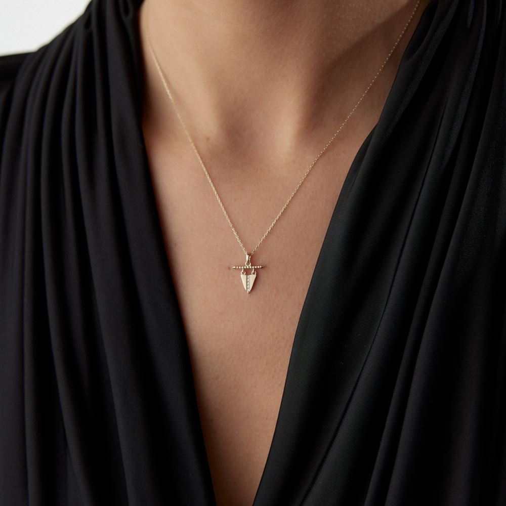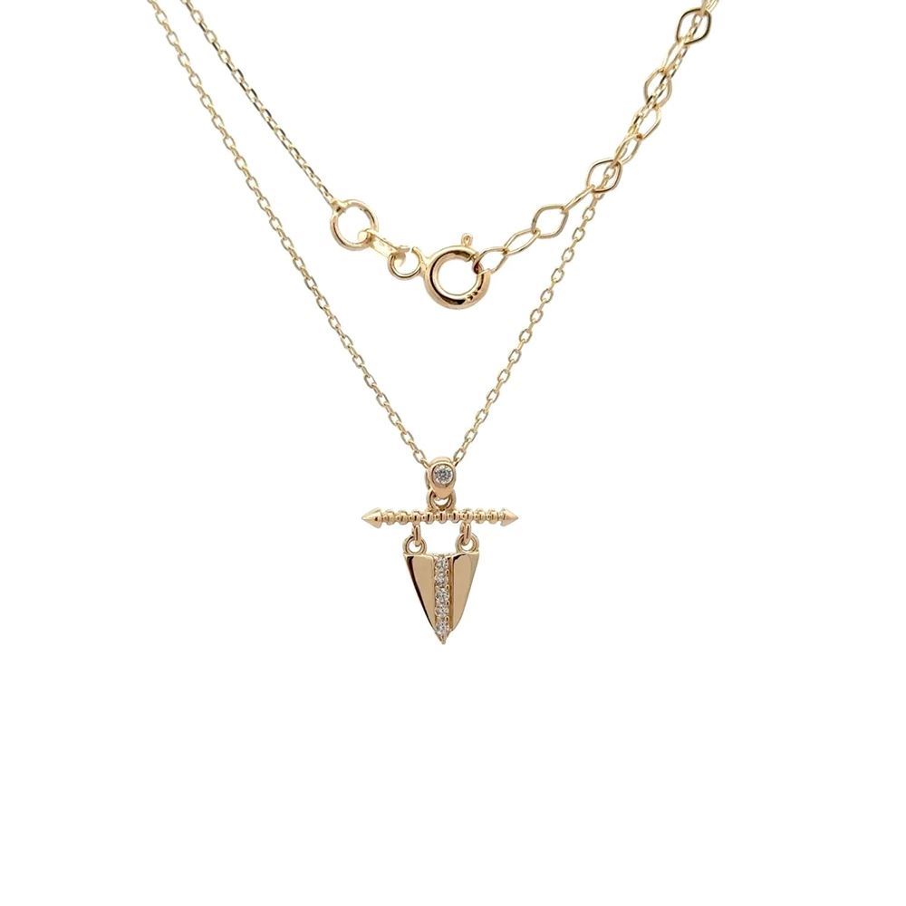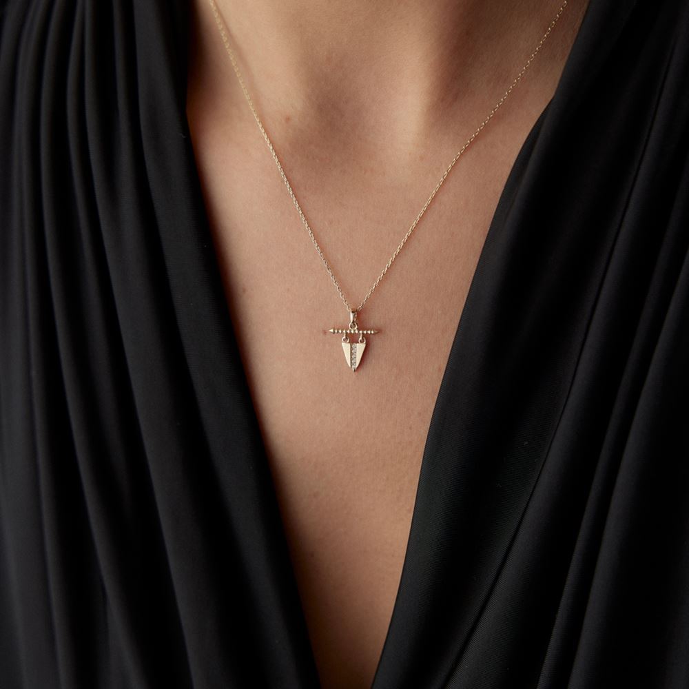 Modern çivi tasarımı ve parlak taş detaylarıyla dikkat çeken bu kolye, sade ve şık bir görünüm sunar.