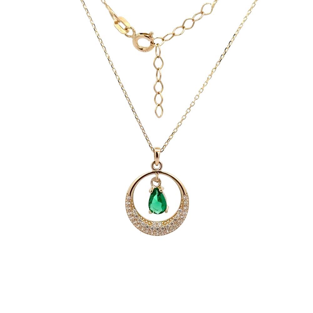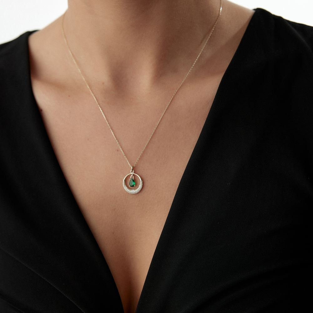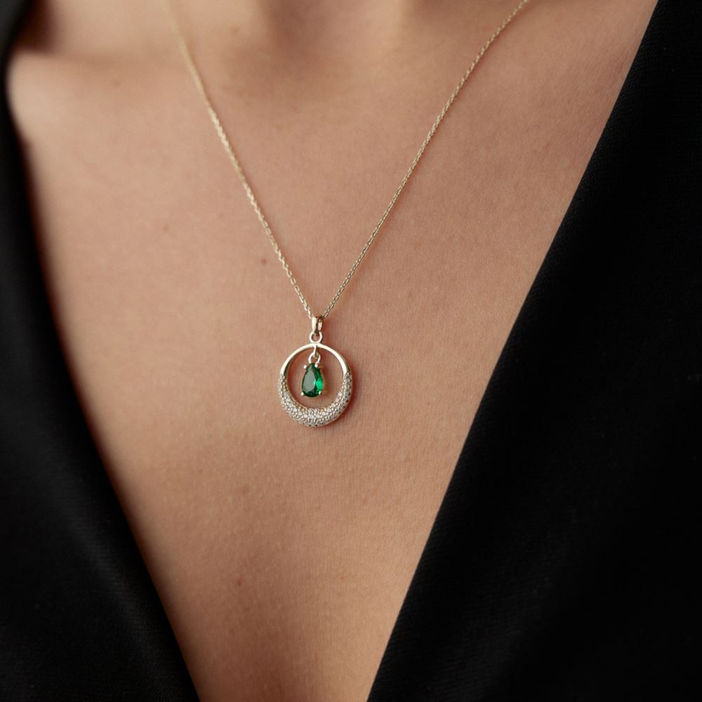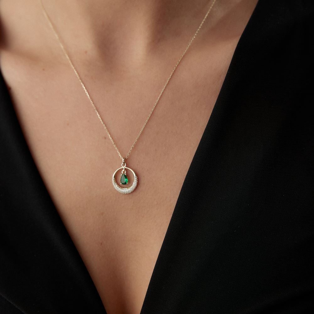 Damla Yeşil Taşlı Hilal Tasarım Kolye damla taş detayları ve hilal formuyla zarif bir şıklık sunar.