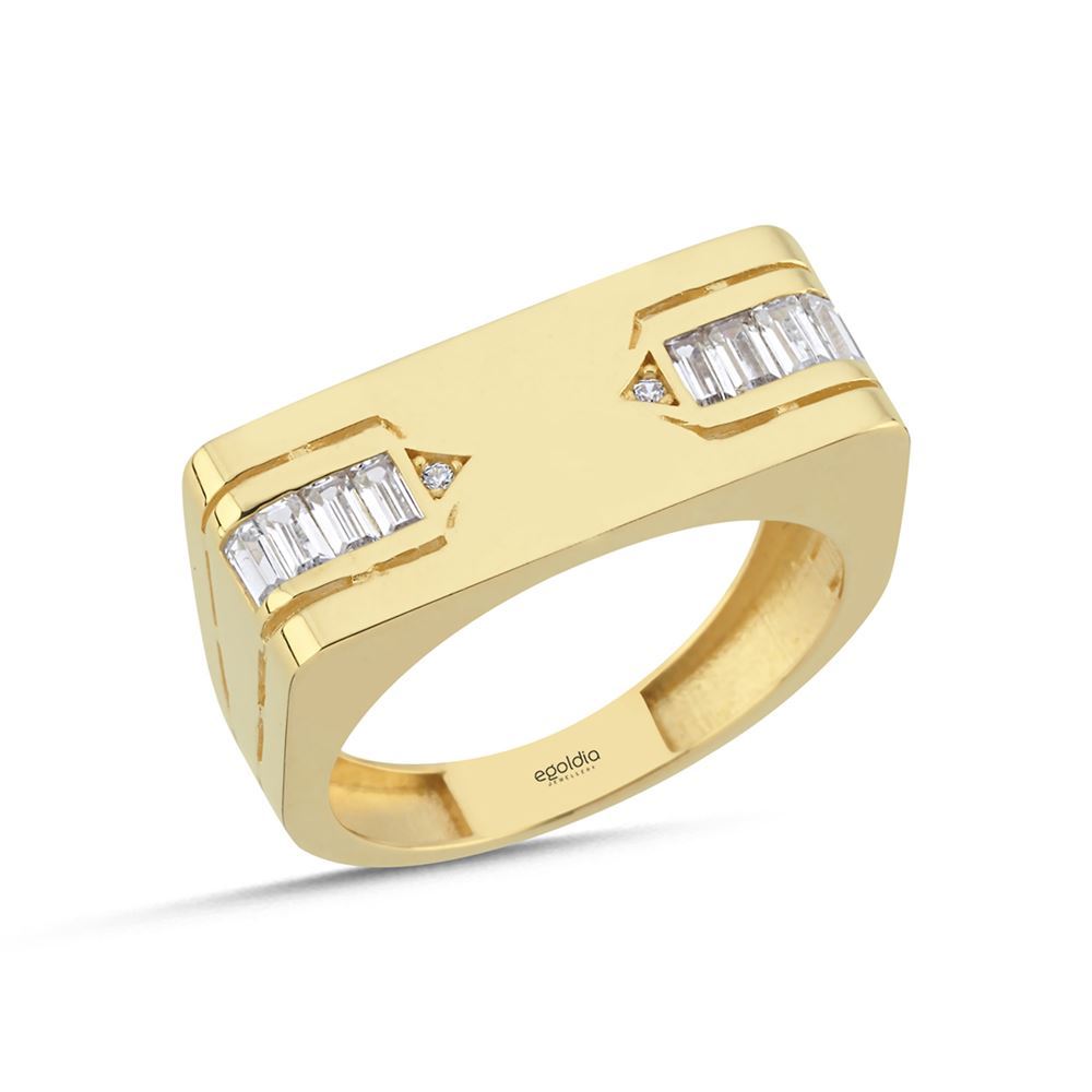 Dikdörtgen Tasarım Baget Taşlı Yüzük, güçlü ve zarif geometrik formu baget taşlarla buluşturur. 14 ayar altın kalitesiyle, özel anlarınıza anlam katacak eşsiz bir hediye.