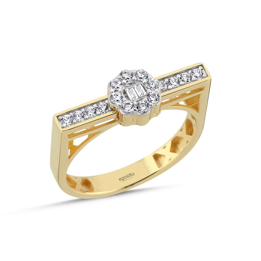 Dikdörtgen Tasarım Çiçek Taşlı Yüzük, zarif çiçek motifi ve baget taşların uyumuyla romantik bir duruş sergiler. 14 ayar altının işçiliği, bu yüzüğü unutulmaz bir hediye yapar.