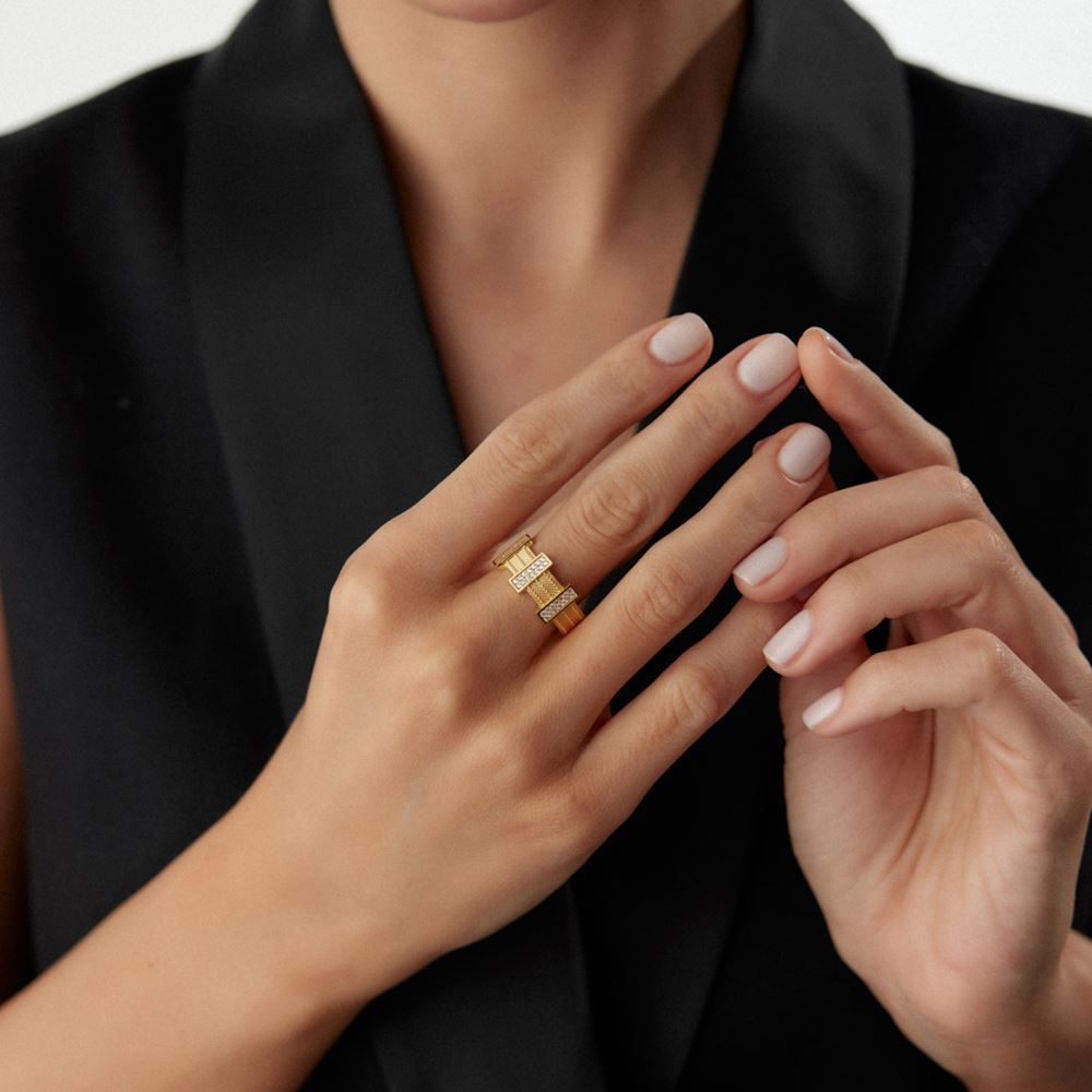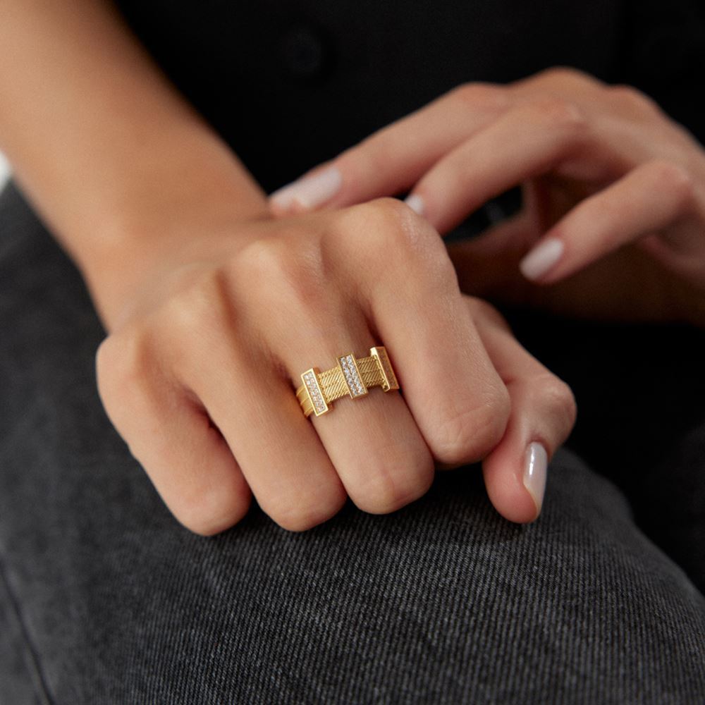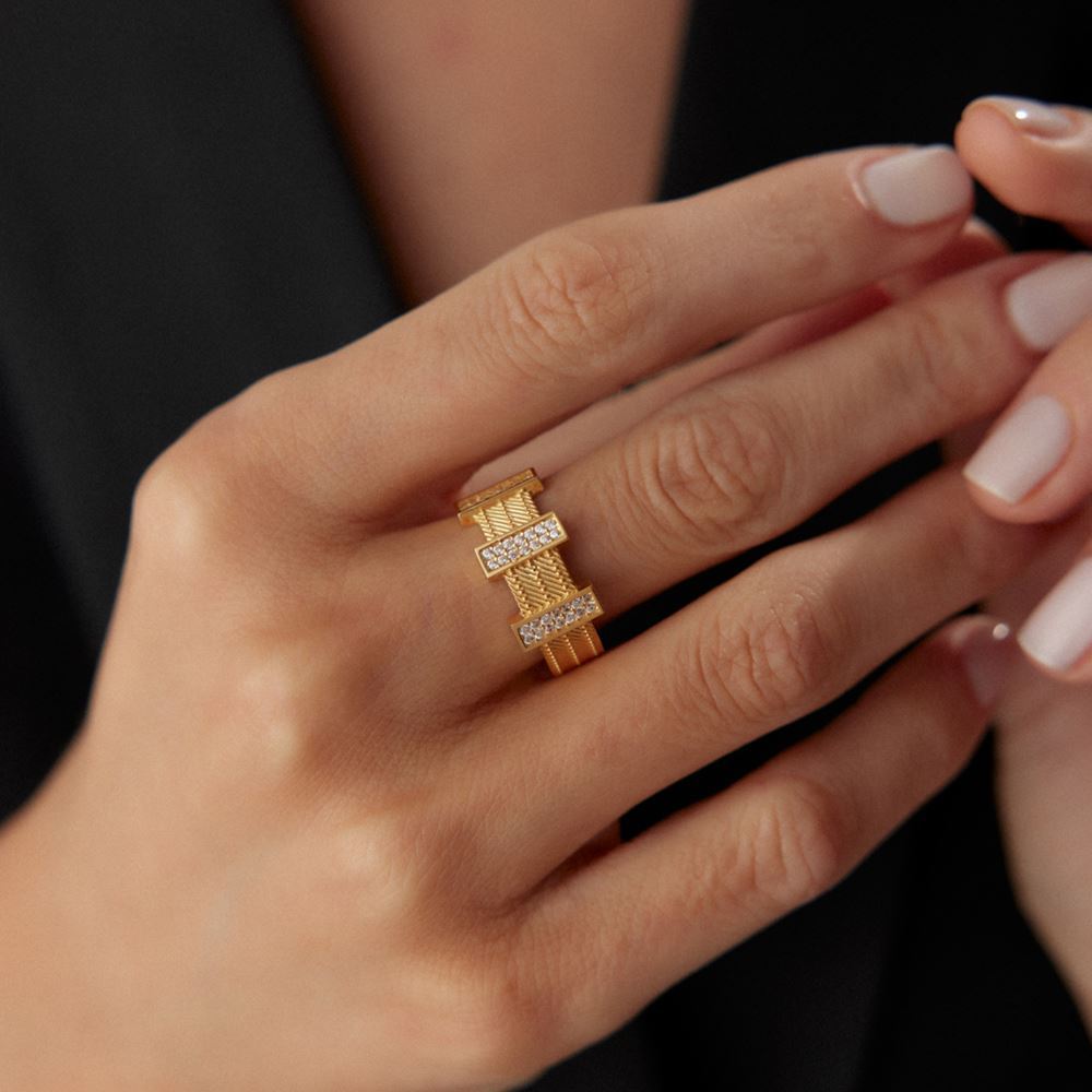 Dikdörtgen taş detaylarıyla tasarlanan Kalze yüzük, modern ve şık bir görünüm sağlar.