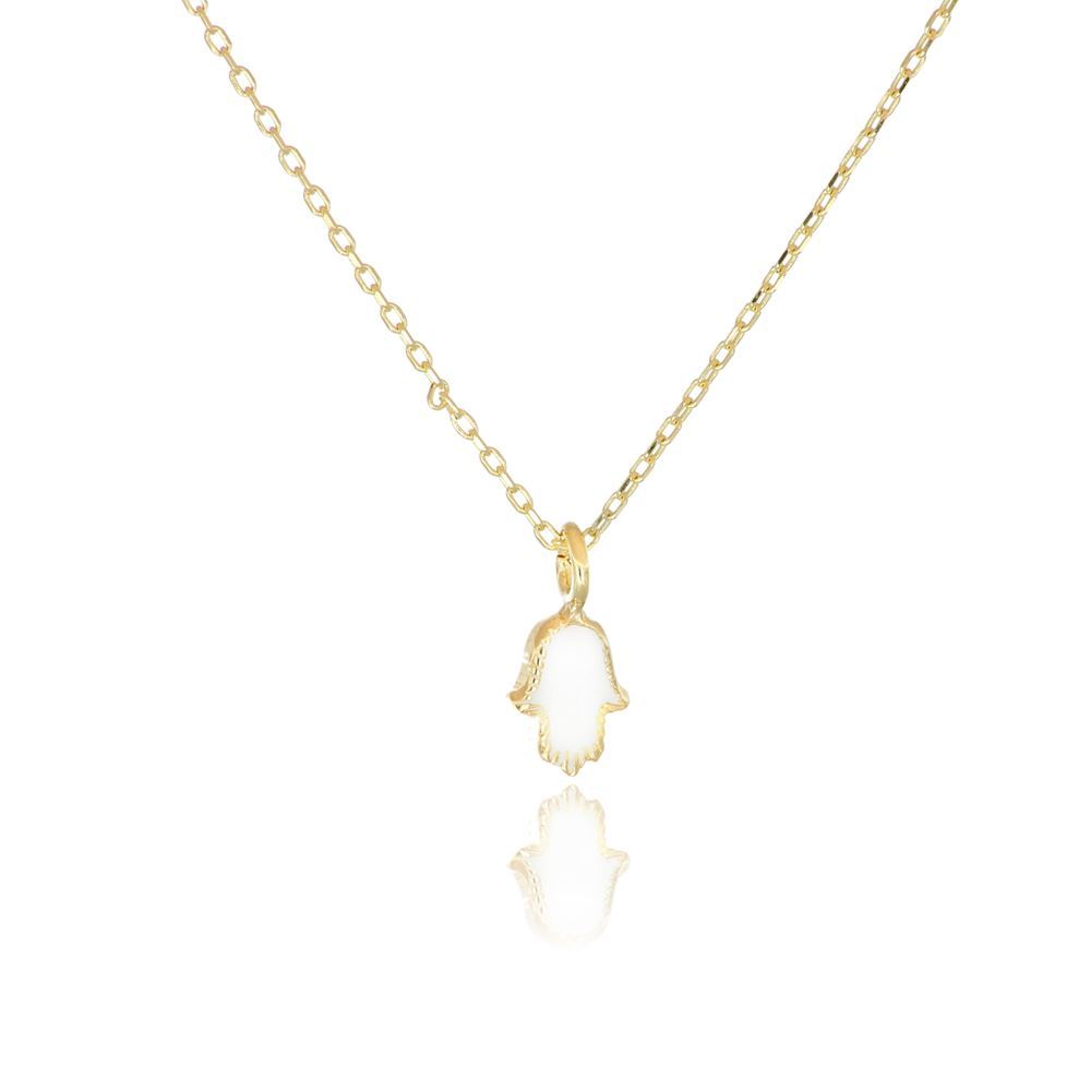 Fatma eli beyaz mineli kolye, zarif tasarımı ve anlamlı detaylarıyla dikkat çeker.