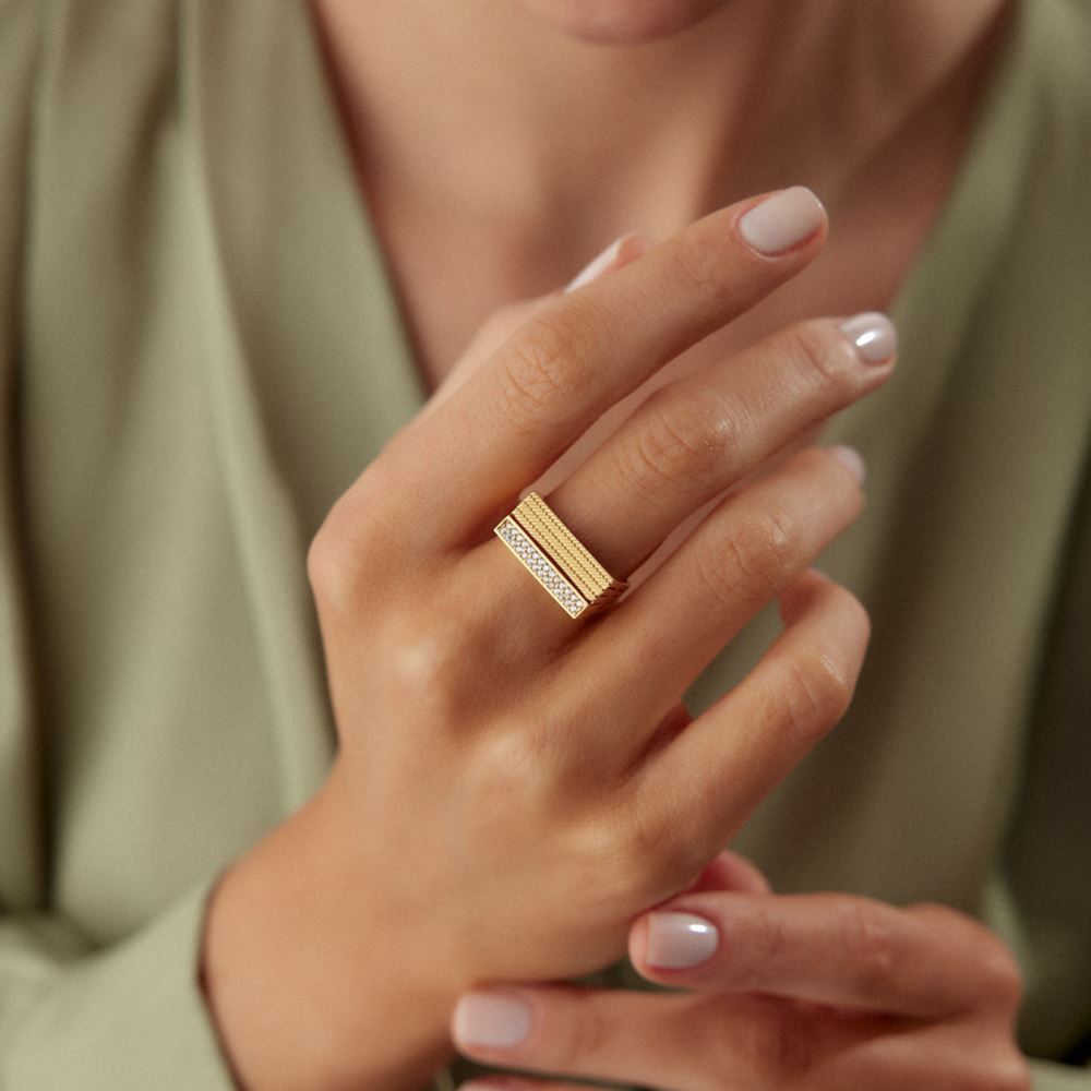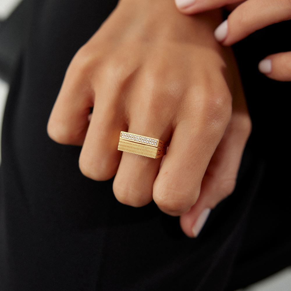 Geometrik çizgiler ve taş detaylarıyla tasarlanan Kalze yüzük, modern bir tarz sunar.