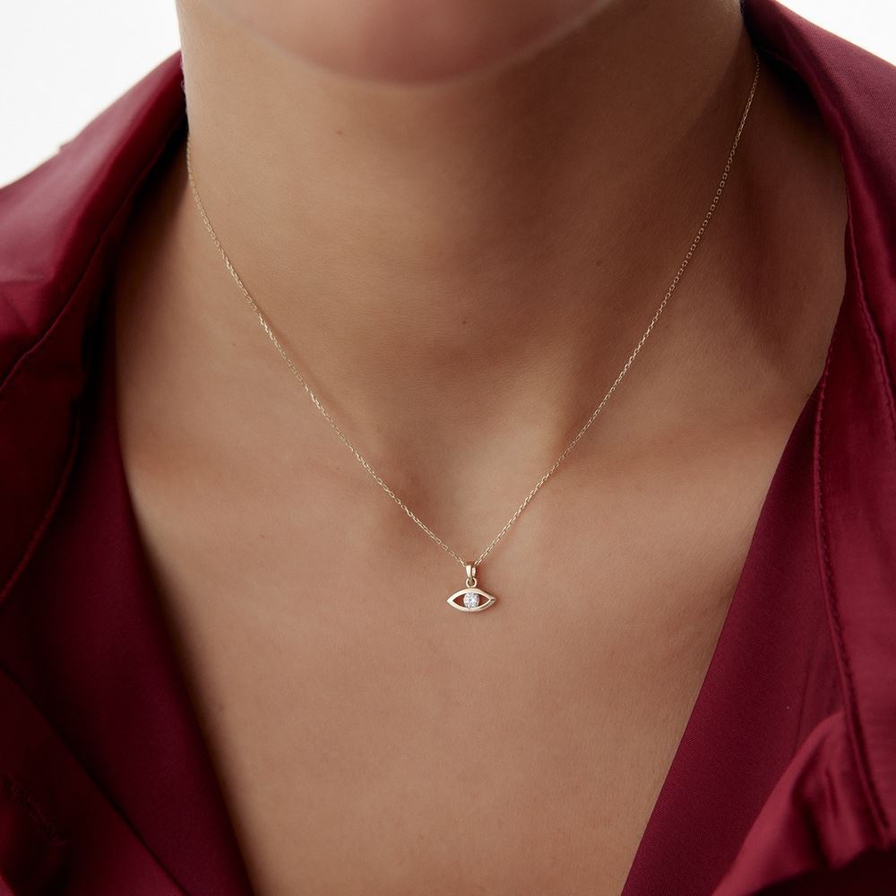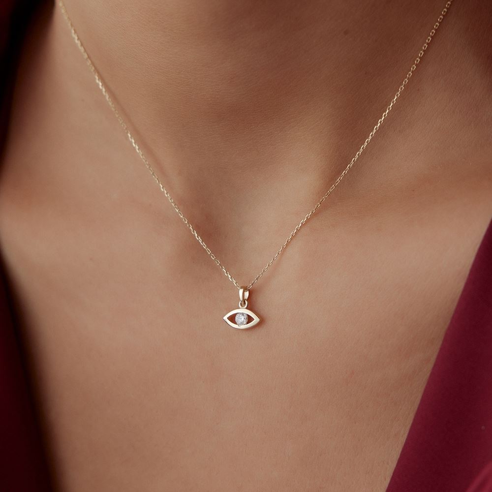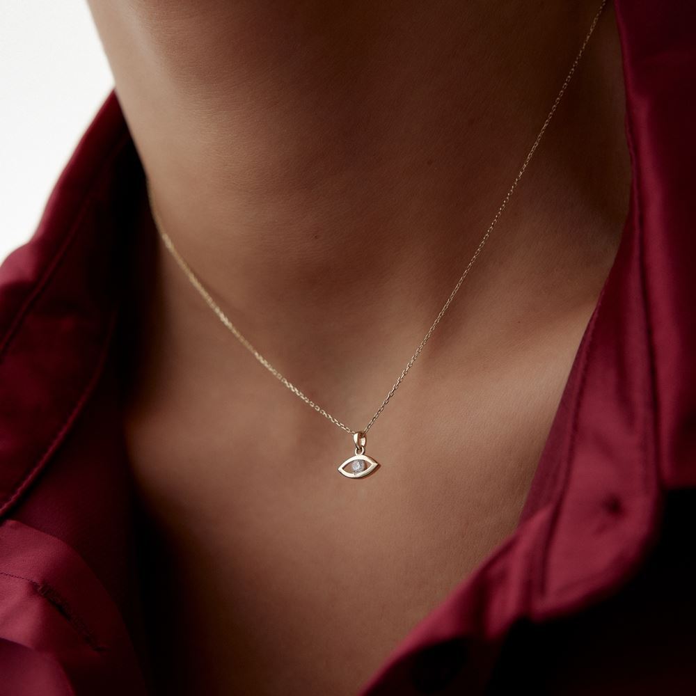 Göz beyaz taşlı kolye, ışıltılı detayları ve zarif dokunuşlarıyla E-Goldia Jewellery koleksiyonunda fark yaratıyor.