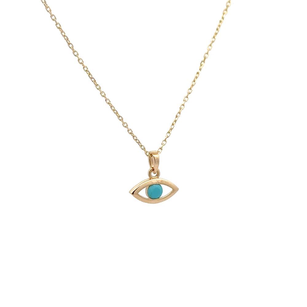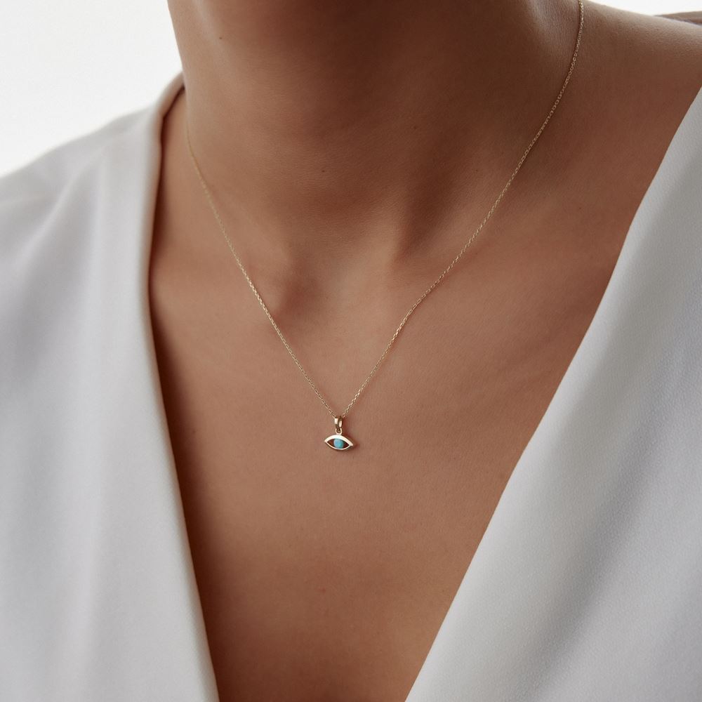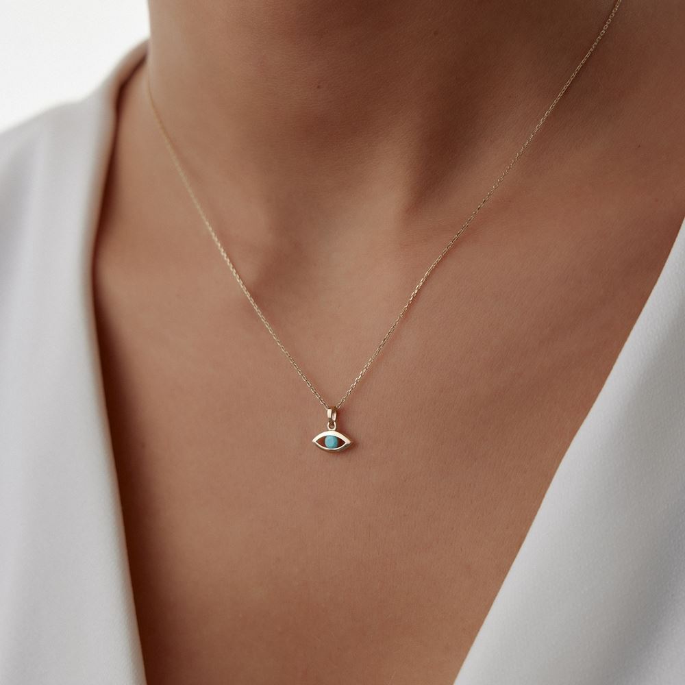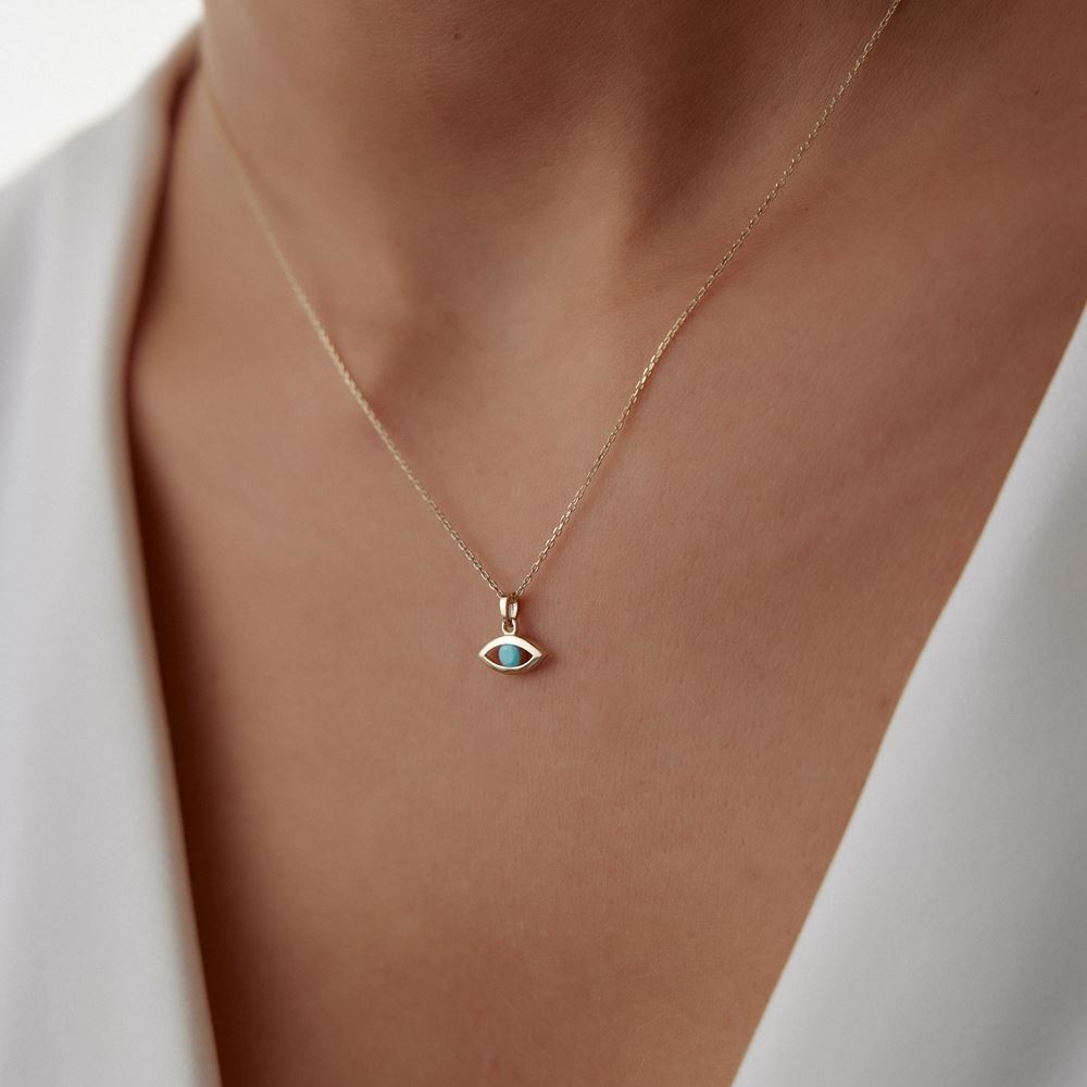 Göz firuze taşlı kolye, mistik enerjisiyle dikkat çeken tasarımıyla E-Goldia Jewellery koleksiyonunda yer alıyor.
