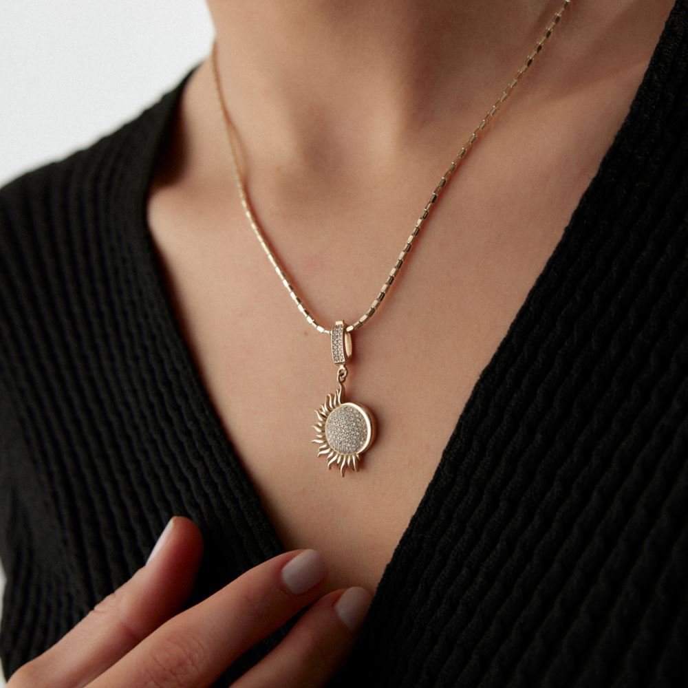 Güneş figürlü taşlı kolye uçları, parlaklık ve enerjiyi simgeliyor. E-Goldia'nın şık tasarımlarını keşfedin.