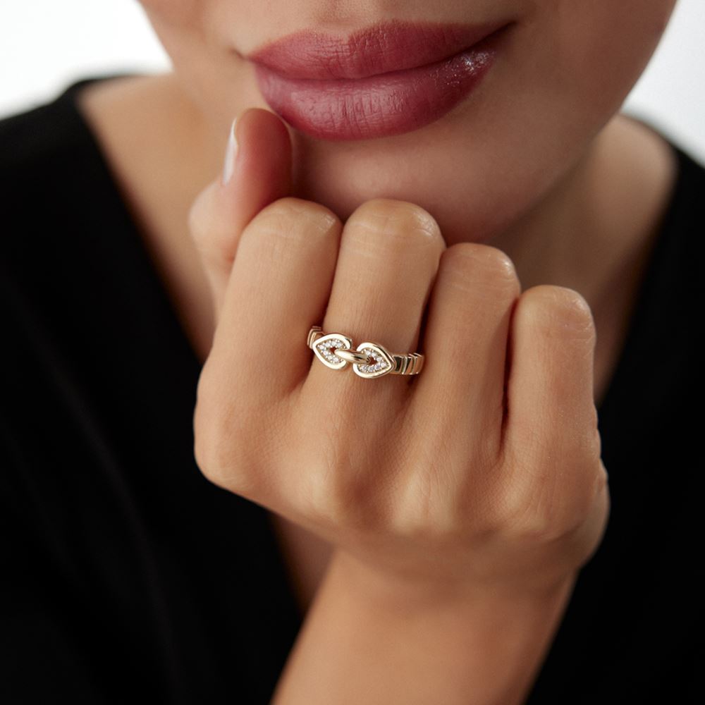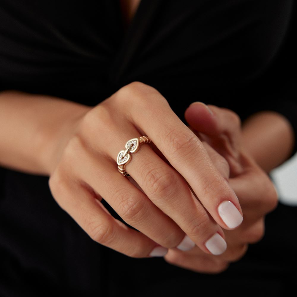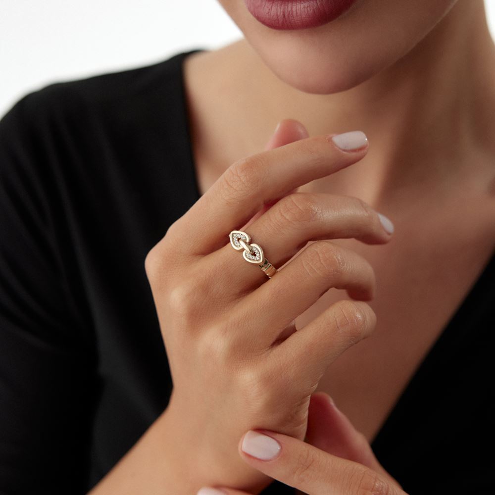 İki kalp taş detaylı yüzük, romantik ve zarif bir görünüm sunar.