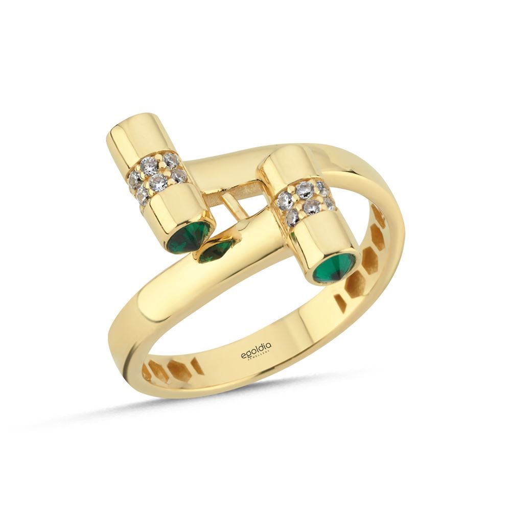 İki Kol Çubuk Tasarım Yeşil Taşlı Yüzük, benzersiz iki kol formu ve canlı yeşil taş detaylarıyla 14 ayar altının kaliteli işçiliğini yansıtıyor. Hem modern hem anlamlı bu yüzük, özel anlar için mükemmel bir seçimdir.
