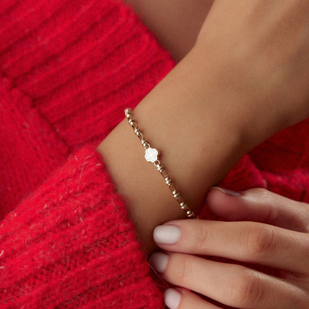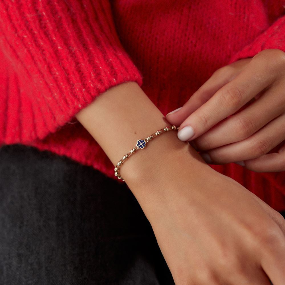 İki Renkli Mavi Ve Beyaz Yonca: Mavi ve beyaz renkleriyle tasarlanmış yonca bileklik, şık ve anlamlı bir aksesuar seçeneğidir.