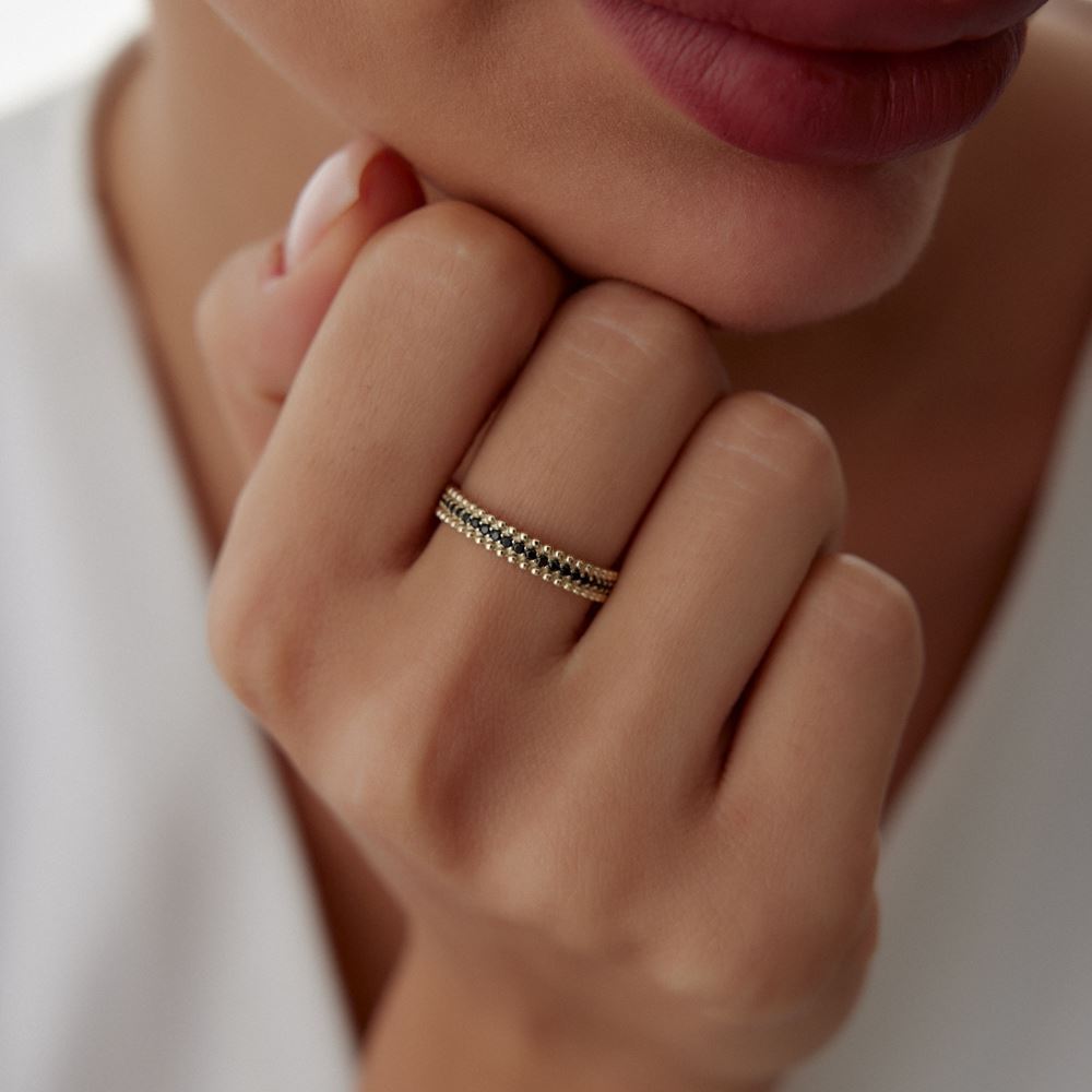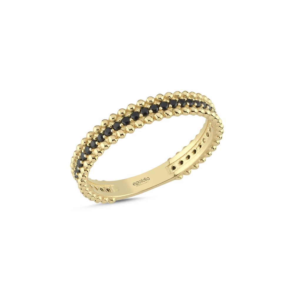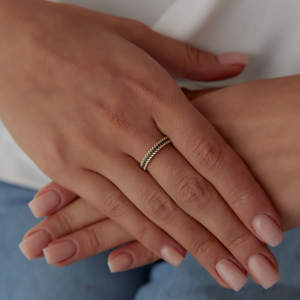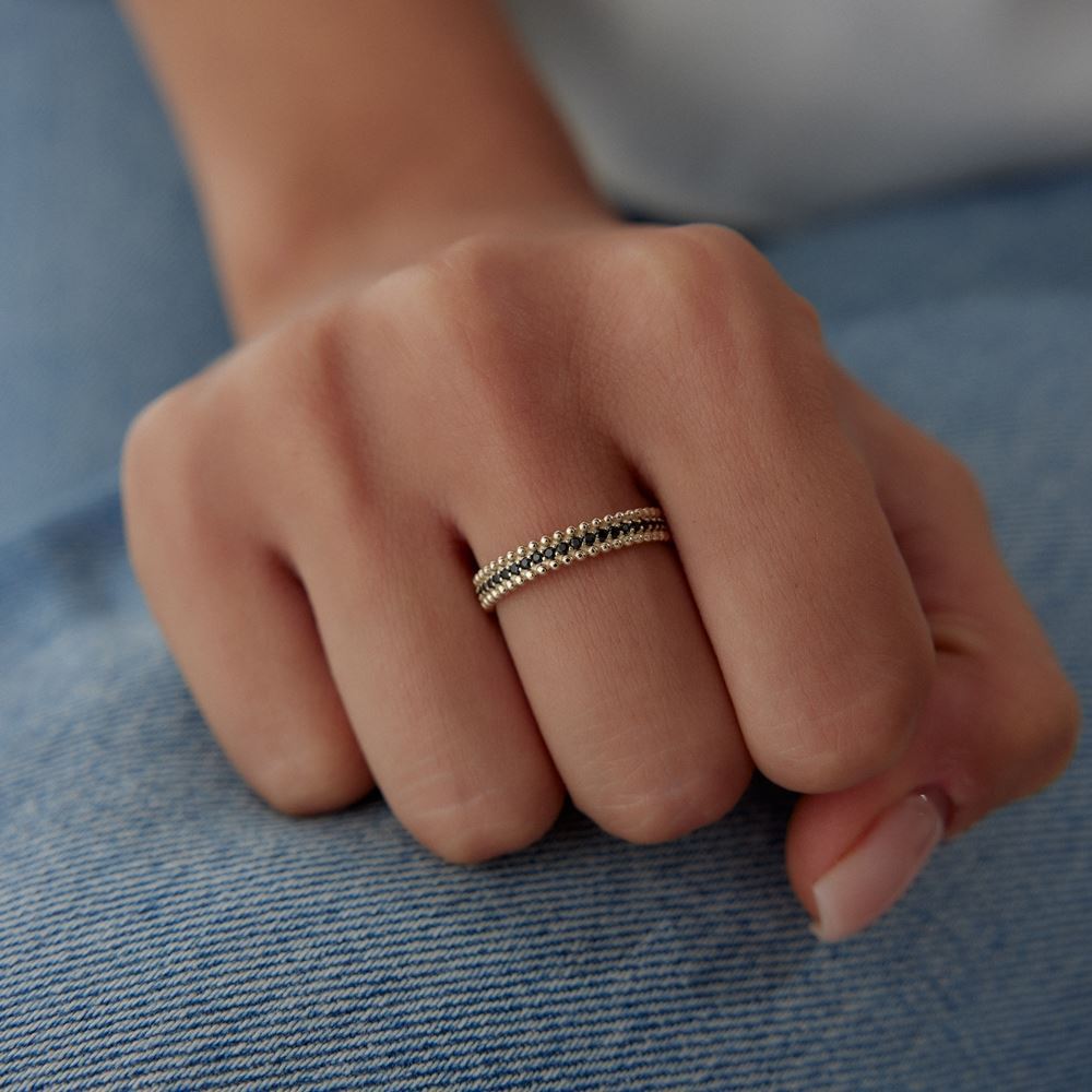 İki Sıra Nokta Tasarım Siyah Taşlı Yüzük