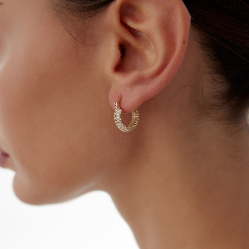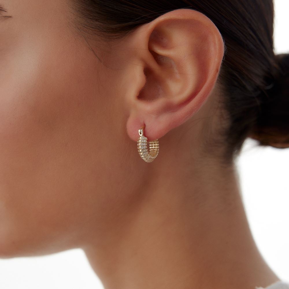 İstiridye tasarımı ve taş detaylarıyla dikkat çeken halka küpe, E-Goldia Jewellery koleksiyonunda zarafetiyle öne çıkıyor.