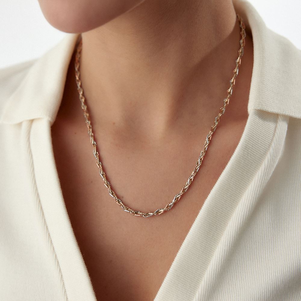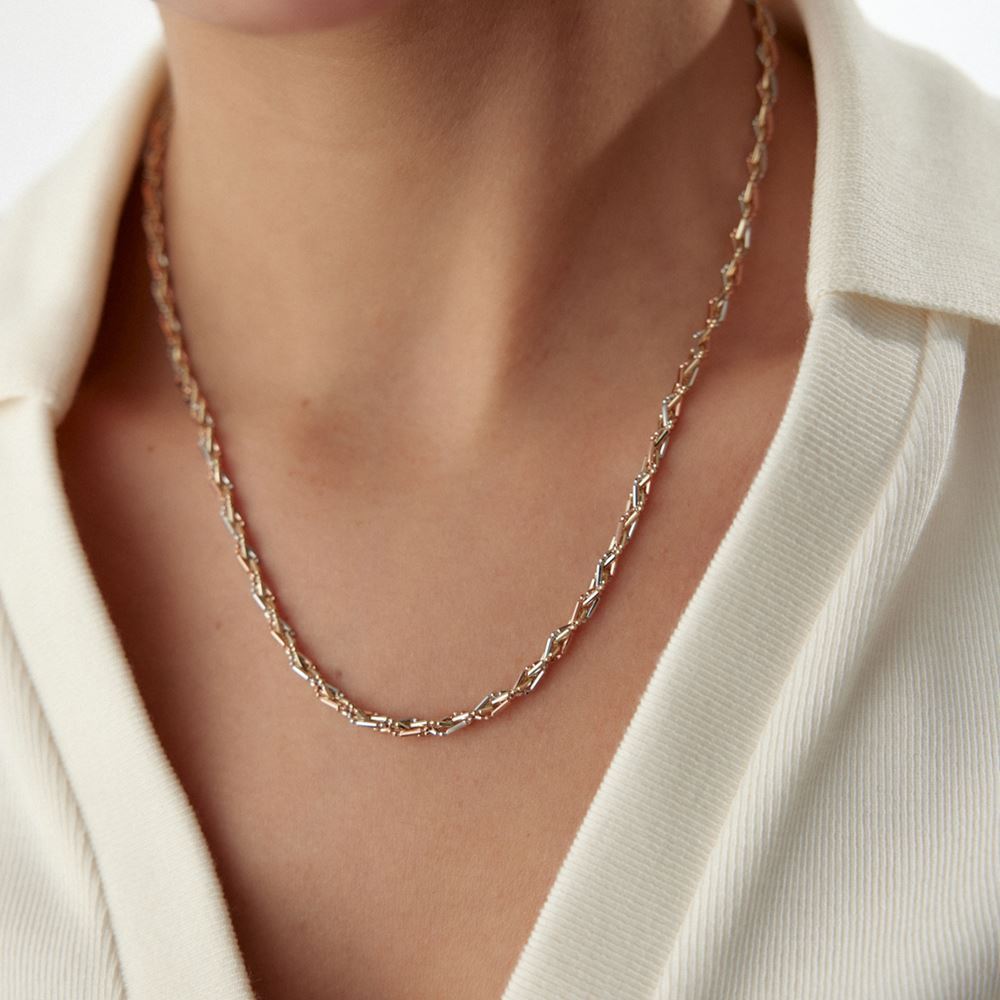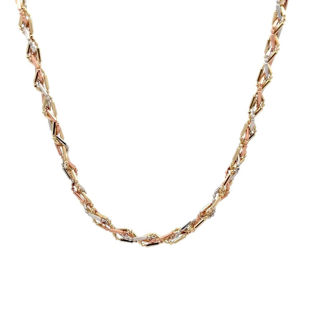 İtalyan Üç Renk Örgü Kolye 48 Cm altın, beyaz ve rose tonlarıyla göz alıcı bir zarafet sunar.