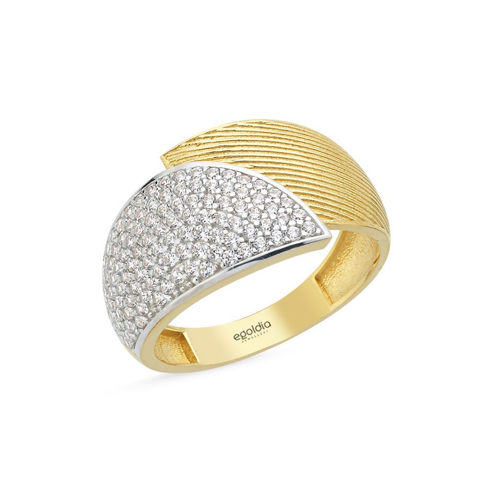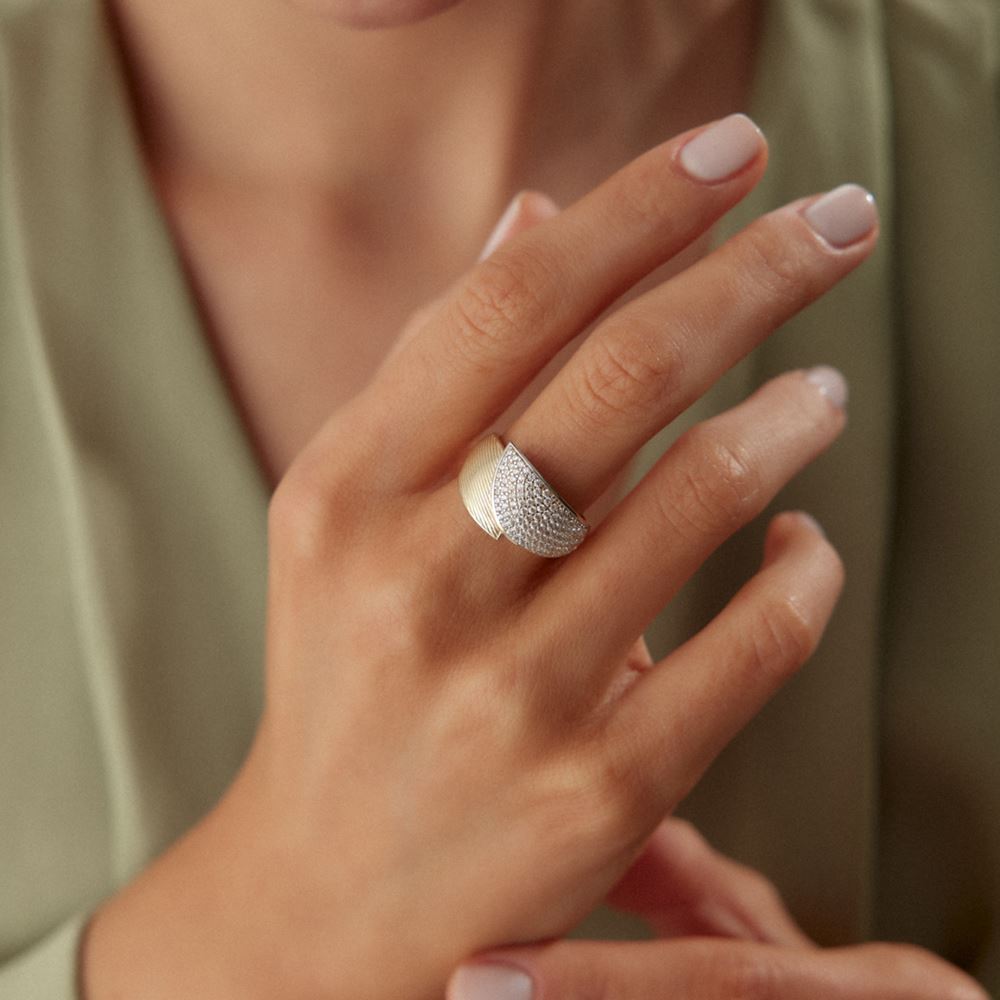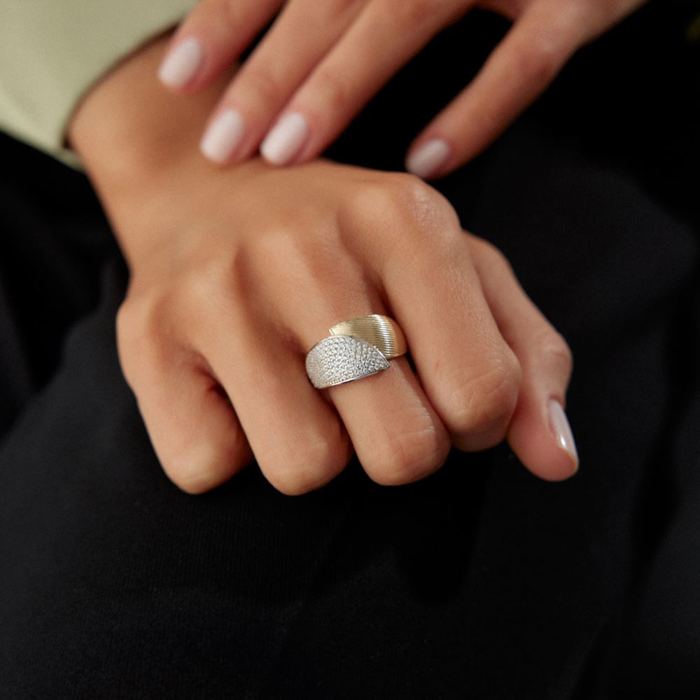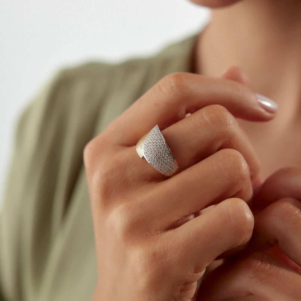 Kalemli taş detaylarıyla tasarlanan yüzük, zarif ve dikkat çekici bir görünüm sunar.
