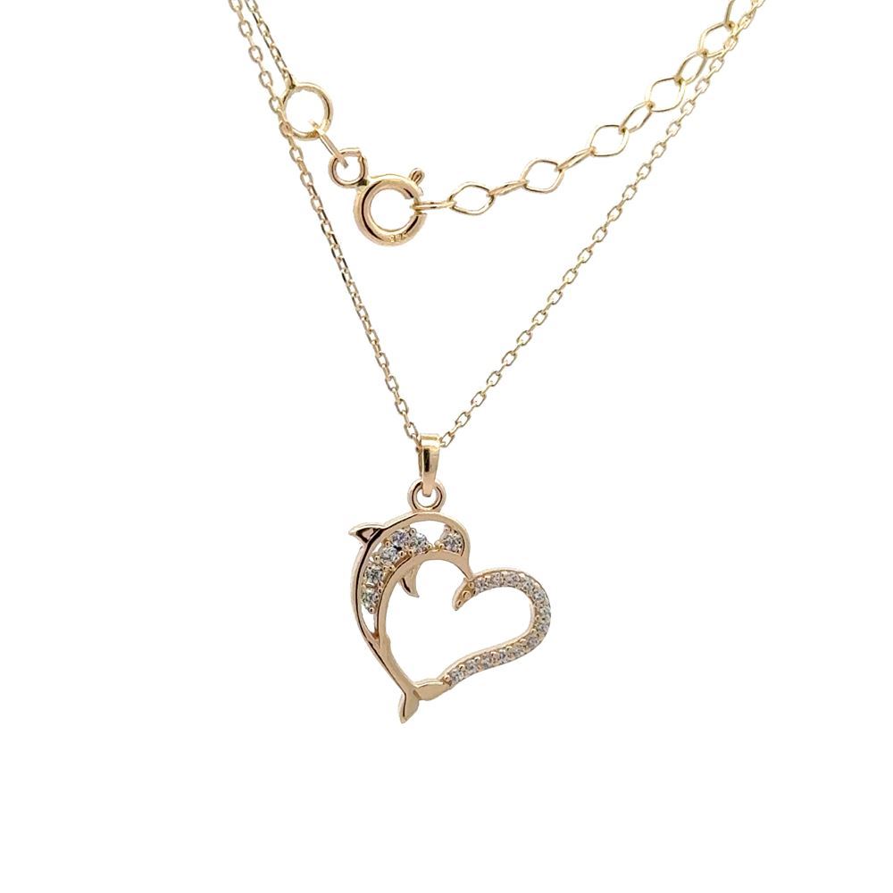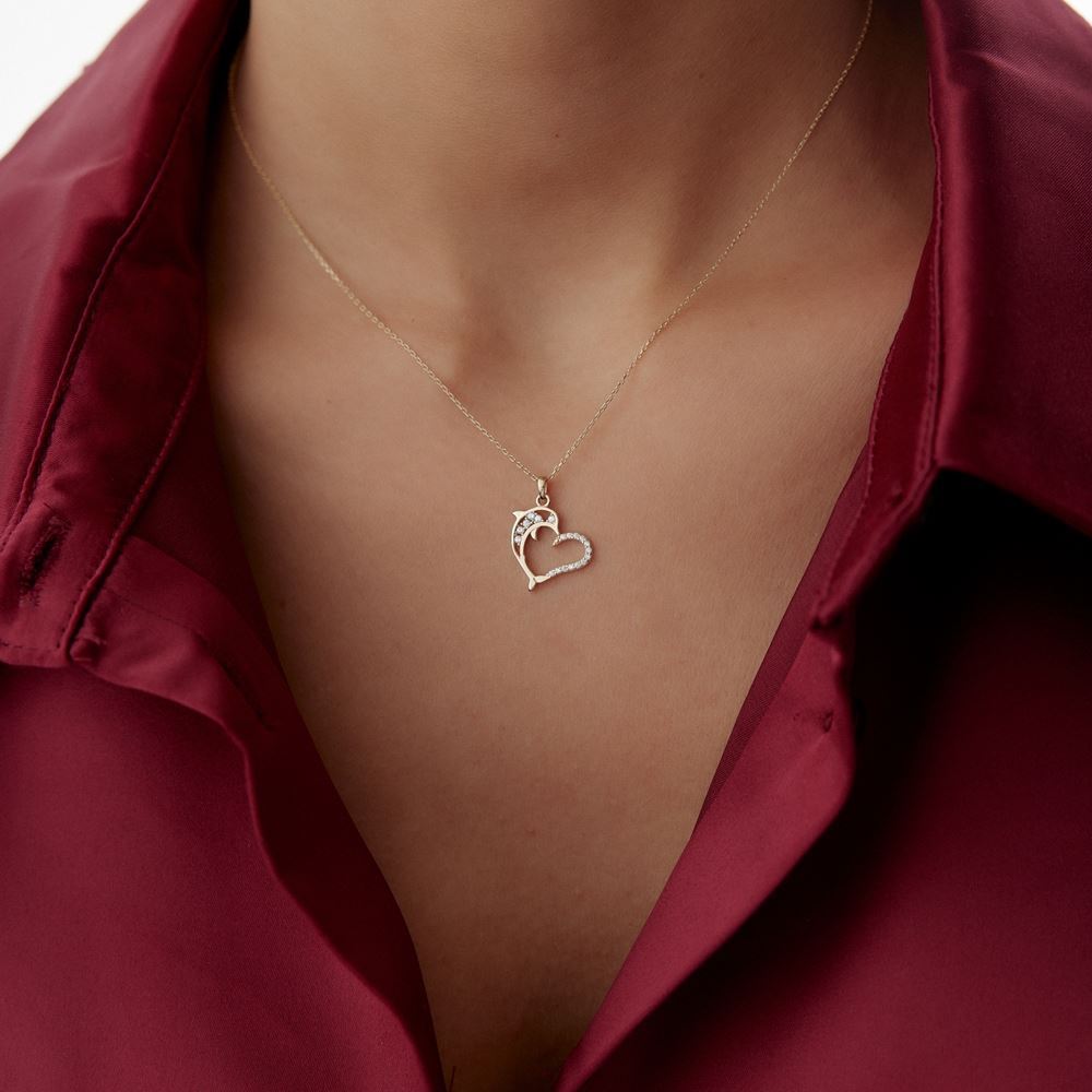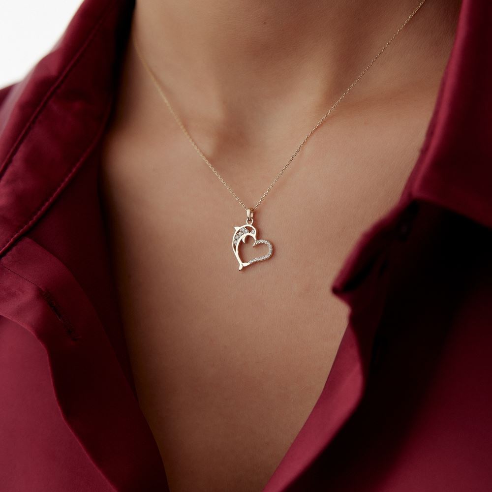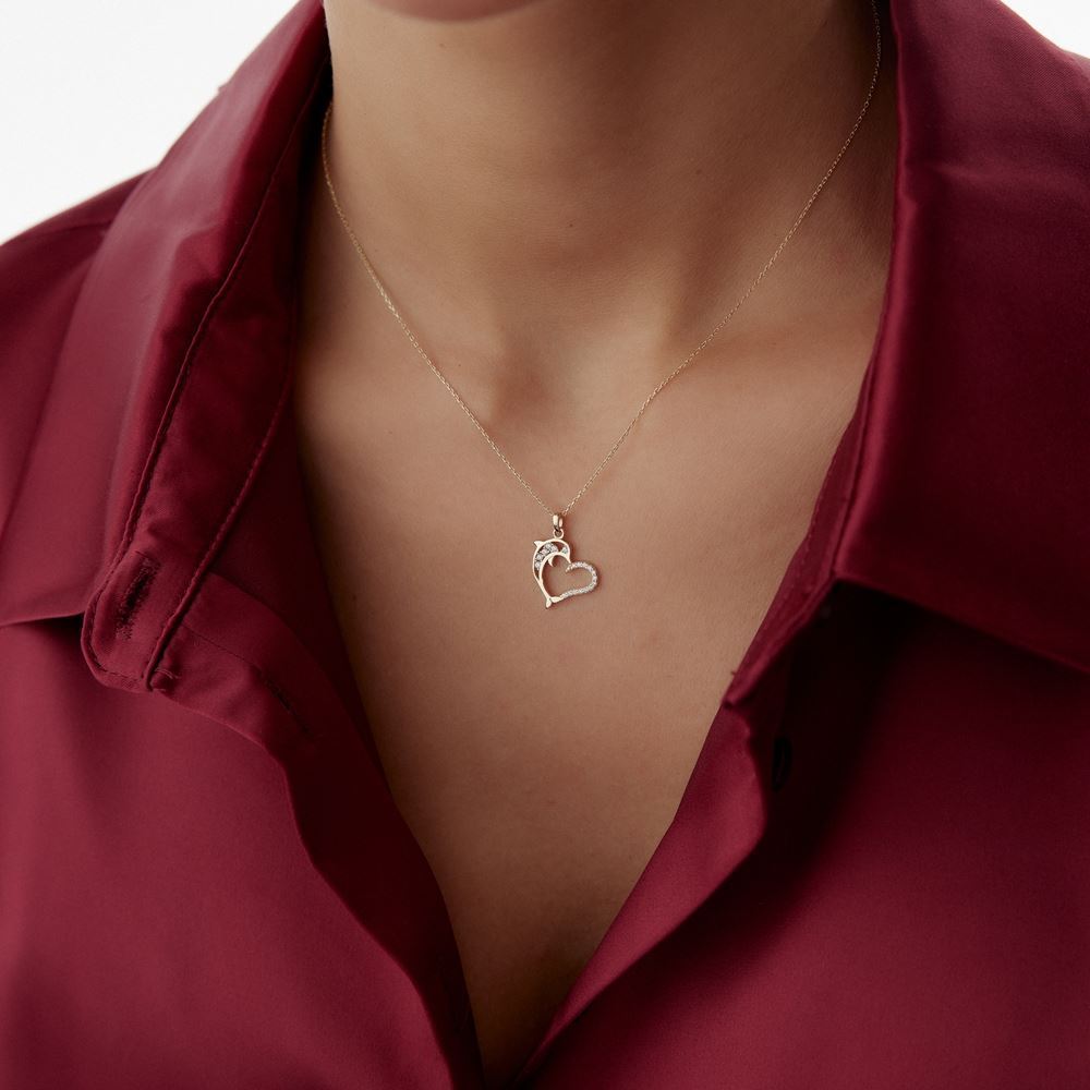 Kalp tasarım yunus figürlü kolye, romantik ve eğlenceli tasarımıyla E-Goldia Jewellery’nin özel koleksiyonlarında.