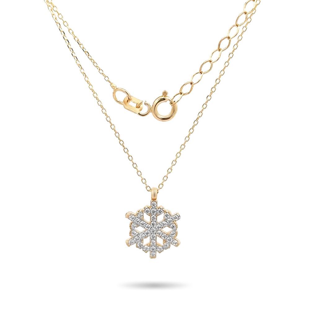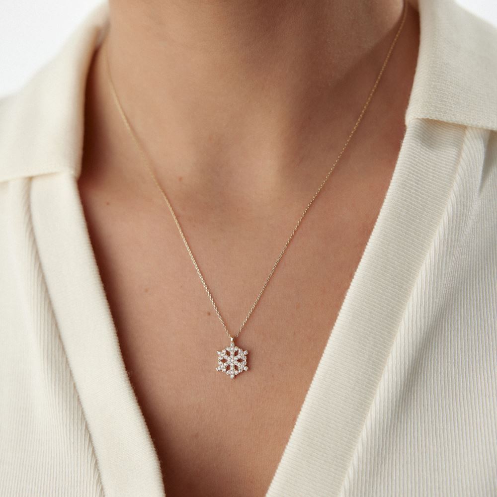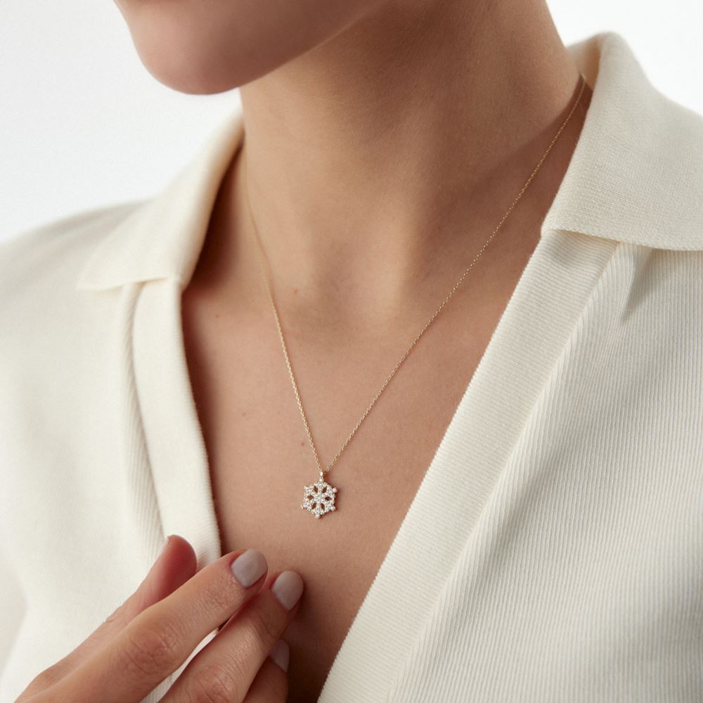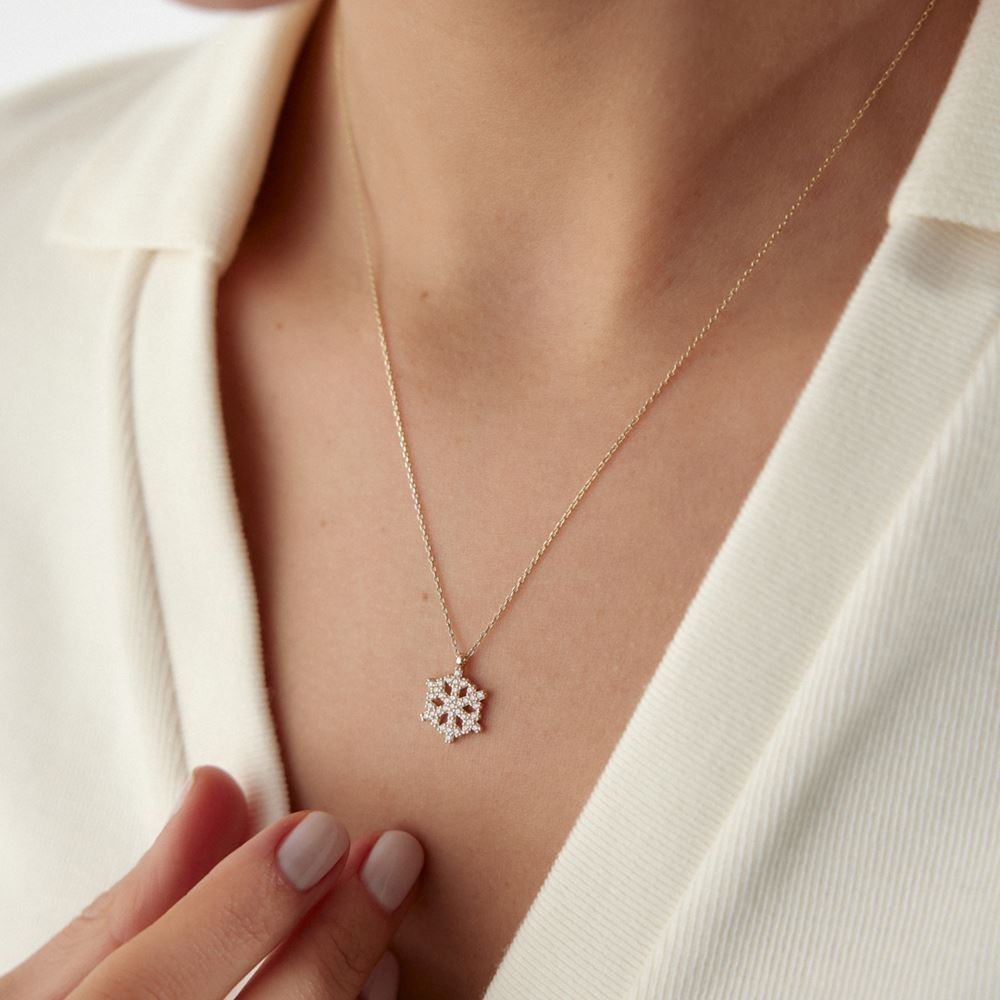 Benzersiz kar tanesi tasarımıyla zarif bir kolye, kışın güzelliklerini ve doğanın saf zarafetini yansıtır.
