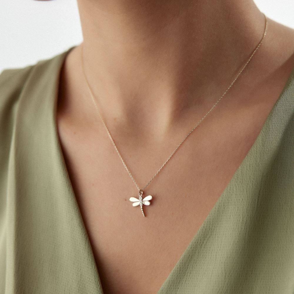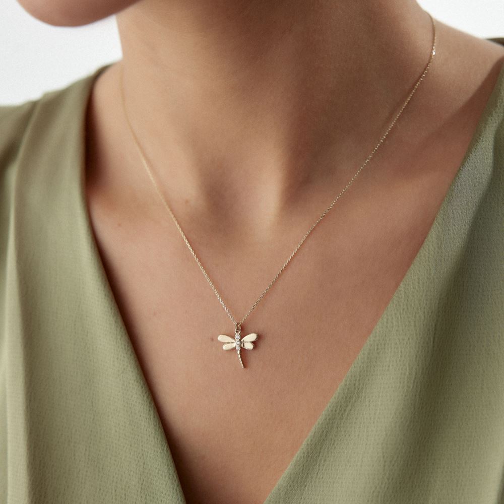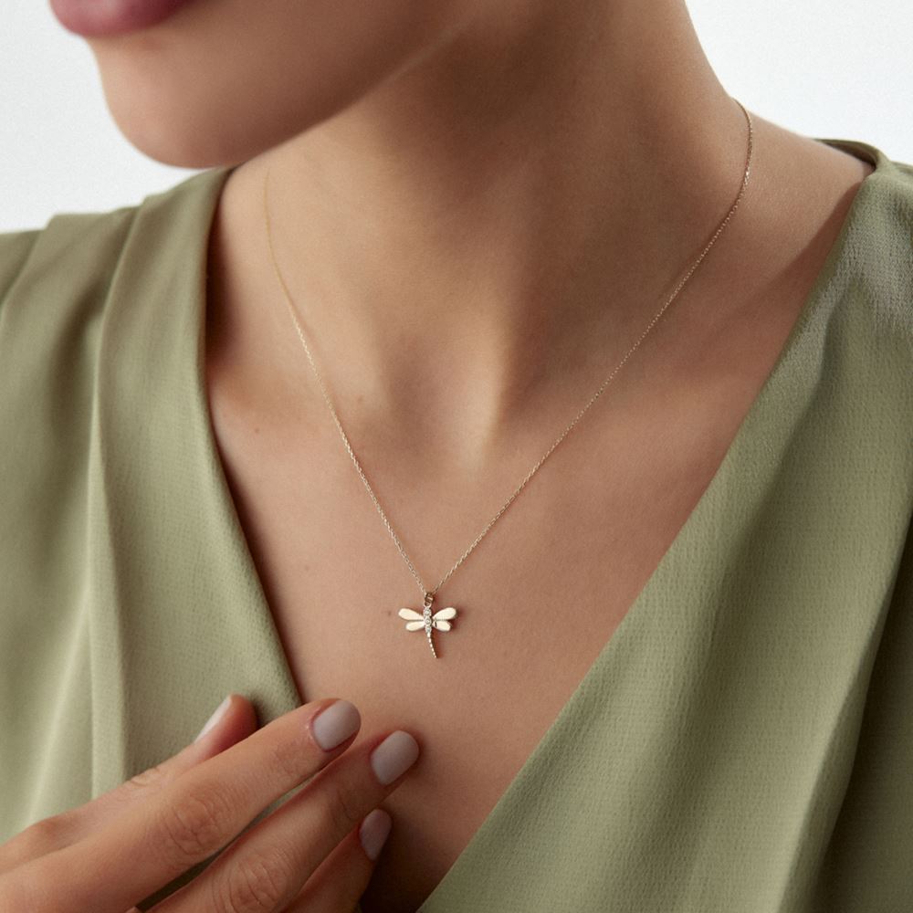 Kelebek figürü ve taş detaylarıyla doğanın zarafetini yansıtan eşsiz bir kolye.