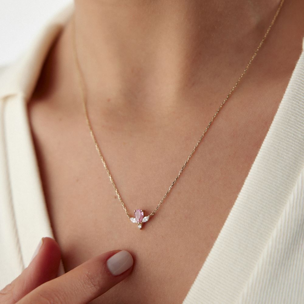 Pembe baget taşlı kolye, ışıltılı tasarımı ve zarif detaylarıyla şıklığı tamamlar.