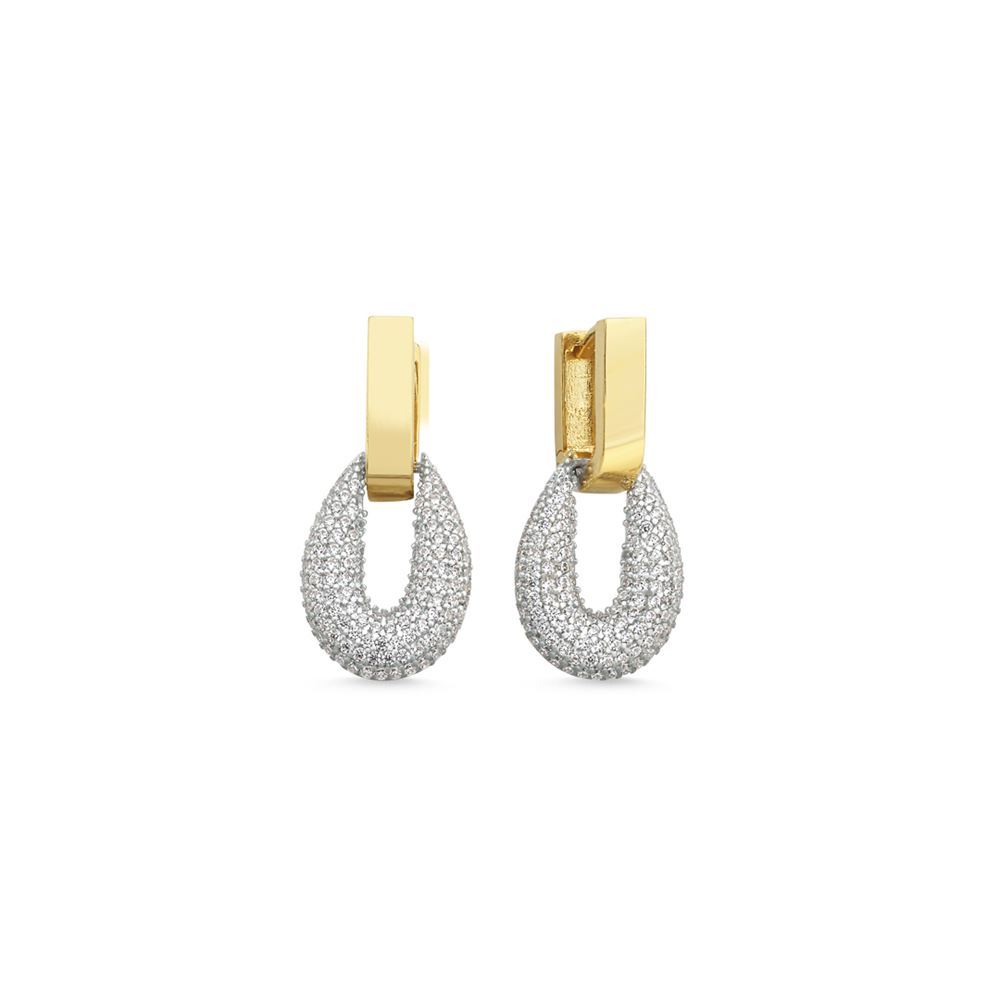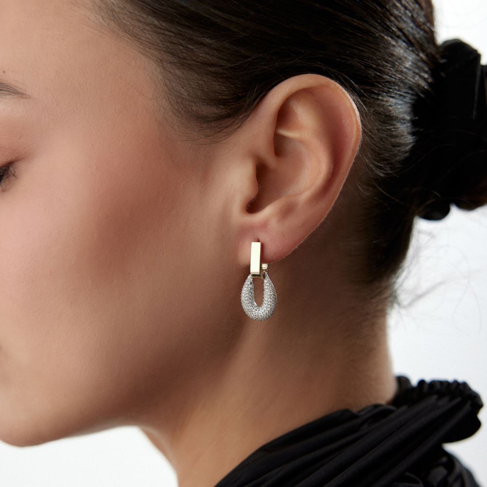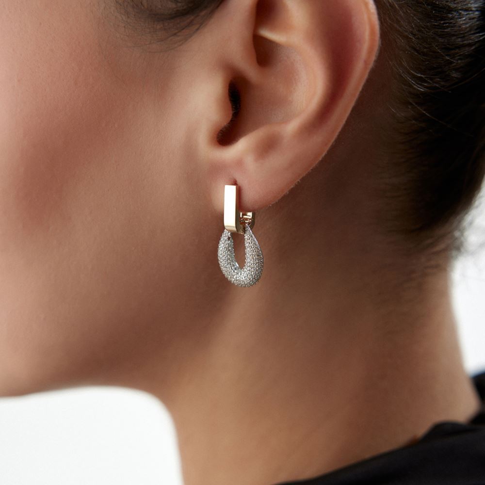 Sallantılı U tasarım taşlı küpe, hareketli detayları ve zarif taş dokunuşlarıyla göz alıcı bir stil sunar.