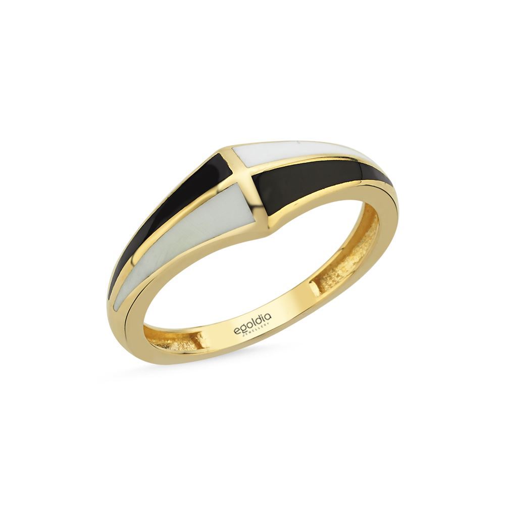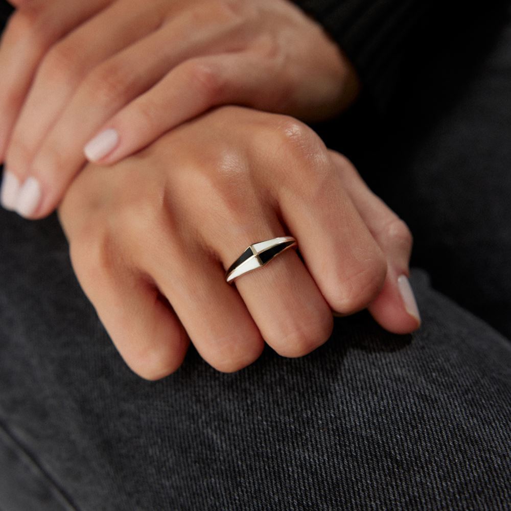 Siyah beyaz mineli yüzük, zarif mineli tasarımı ve şık taş detaylarıyla modern şıklığı yansıtır. Hem zarif hem çarpıcı.