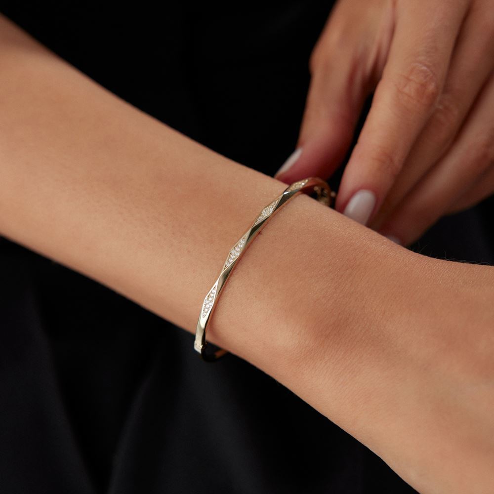 Işıltılı taşlarla süslenen bu tasarım kelepçe, zarif ve göz alıcı bir görünüm sağlar.