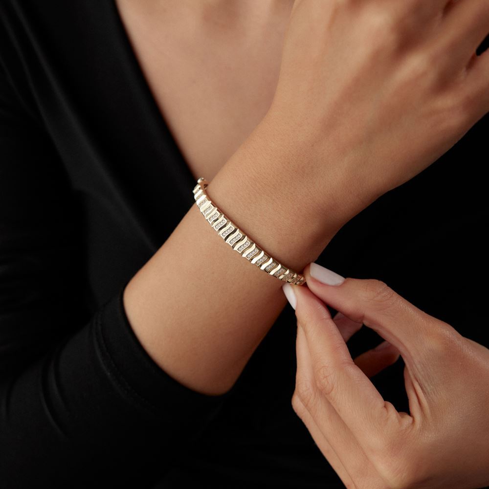Işıltılı taş detaylarıyla tasarlanan bu kelepçe, zarif ve dikkat çekici bir görünüm sunar.