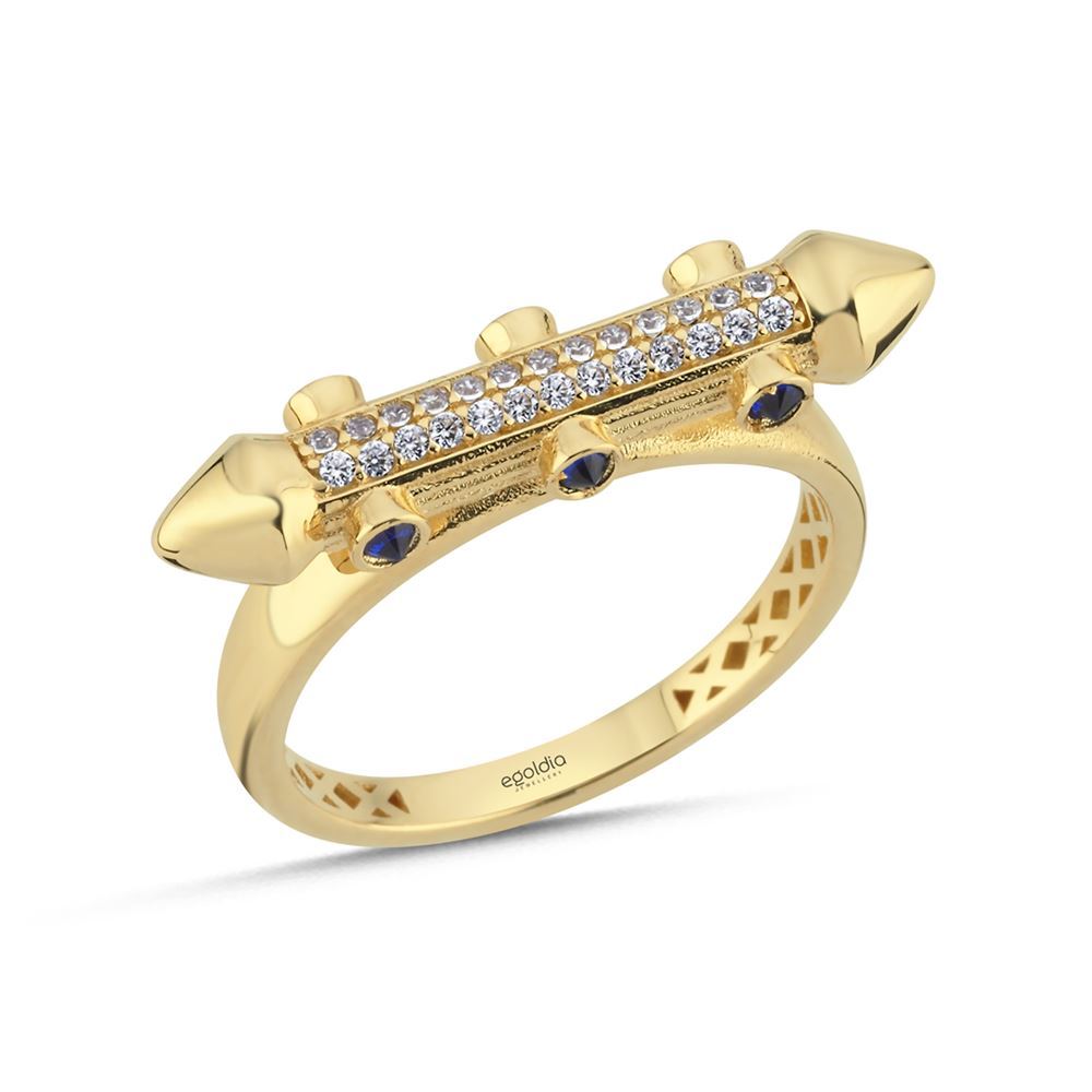 Tek Ok Tasarım Mavi Beyaz Taşlı Yüzük, zarif ok formuyla modern ve anlam dolu bir duruş sergiler. 14 ayar altının incelikle işlenmiş yapısı, mavi ve beyaz taşların parlaklığıyla birleşerek her anınıza sofistike bir ışıltı katar. Kendiniz veya sevdikleriniz için şıklık ve duygusallığı bir arada sunan özel bir hediye seçeneği.