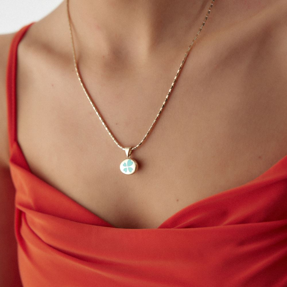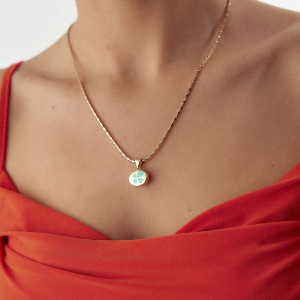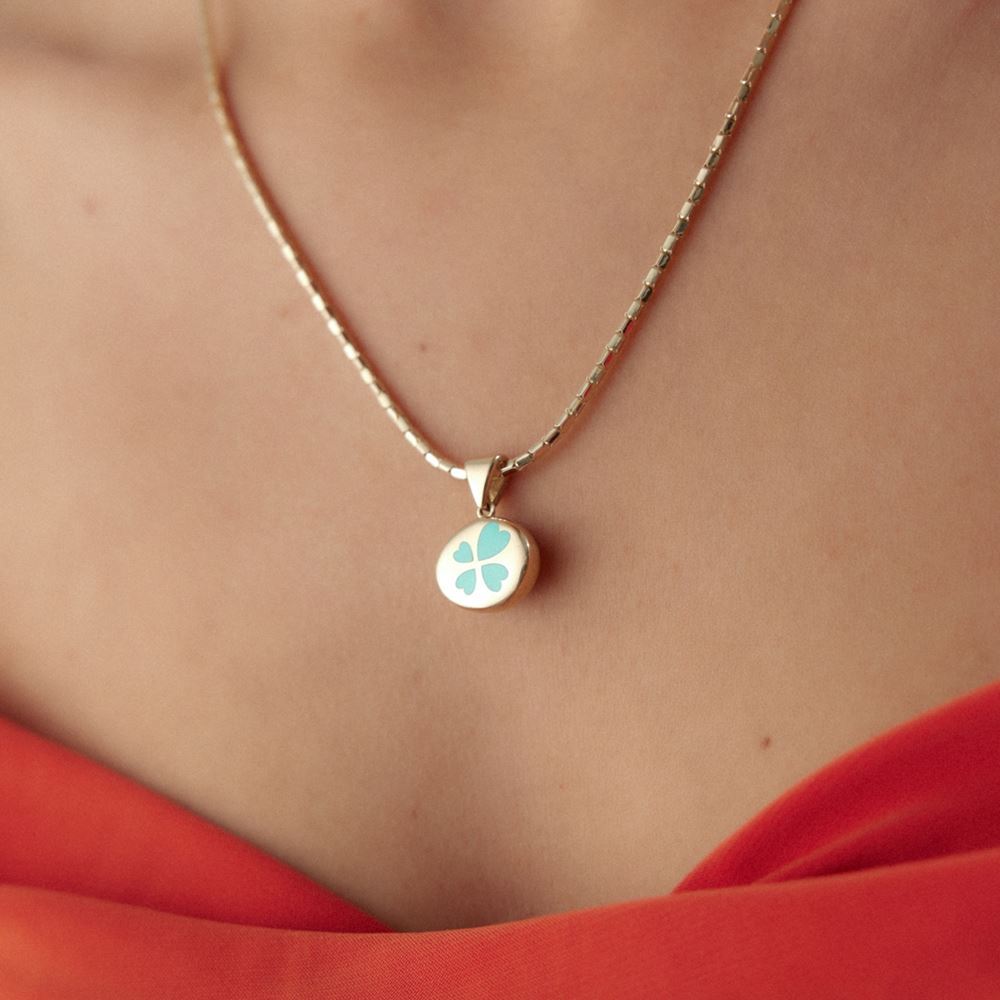 Turkuaz renkli yonca mineli kolye uçları, şans ve zarafeti simgeliyor. E-Goldia'nın özel tasarımlarıyla tanışın.