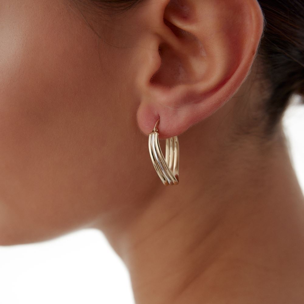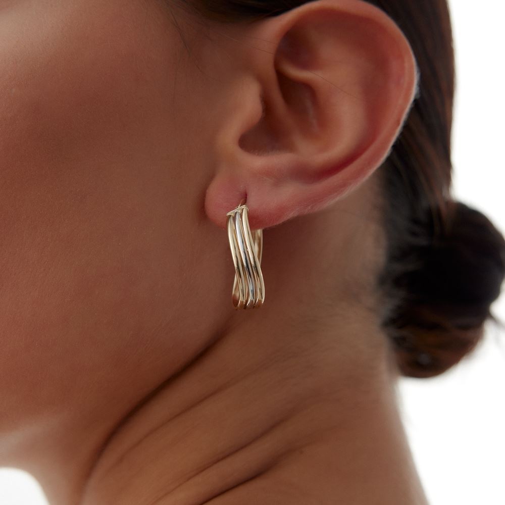 Üç renk dalga tasarım küpe, eşsiz renk kombinasyonu ve modern çizgileriyle E-Goldia Jewellery koleksiyonlarında.