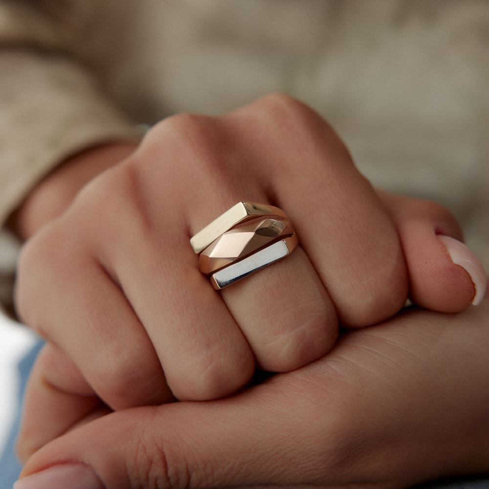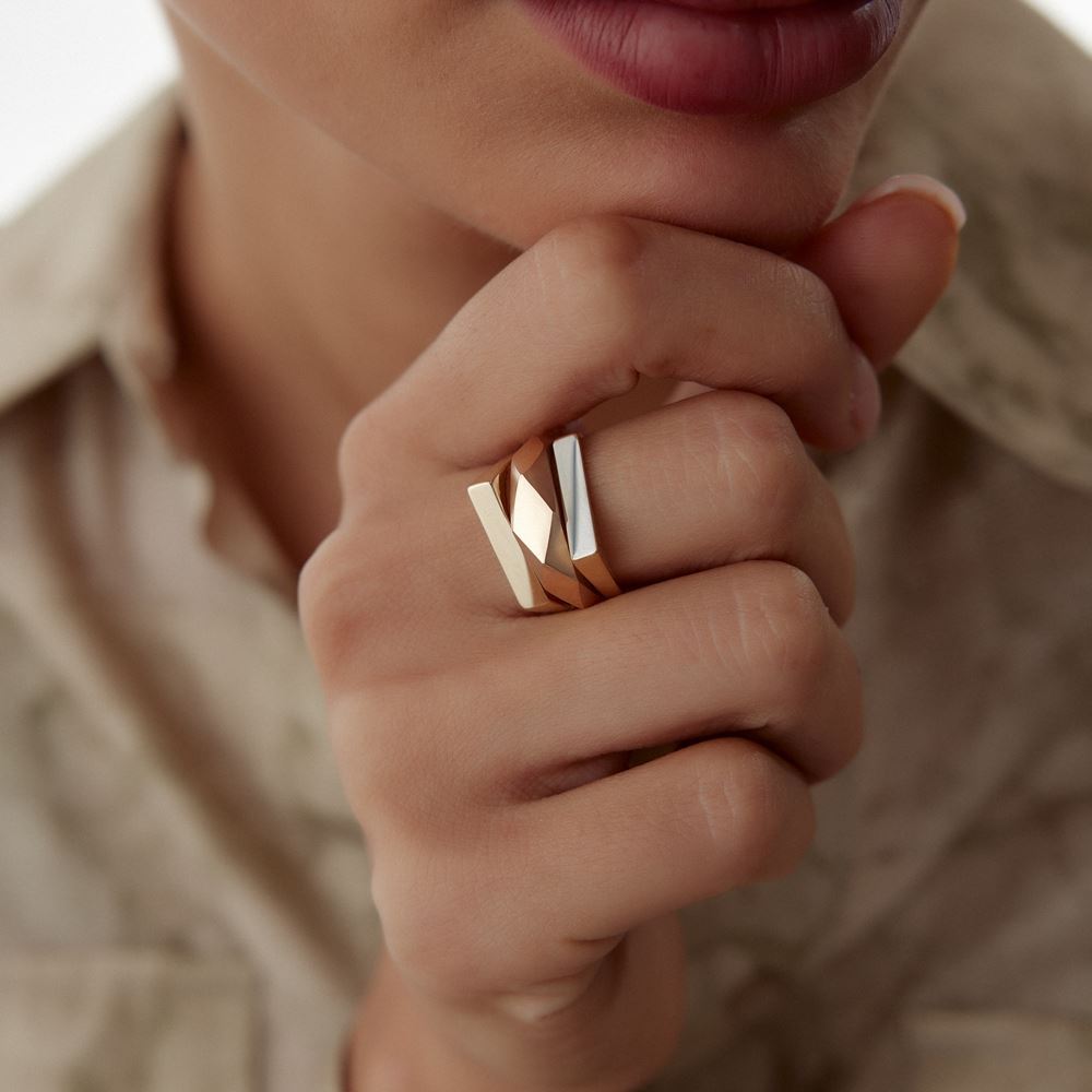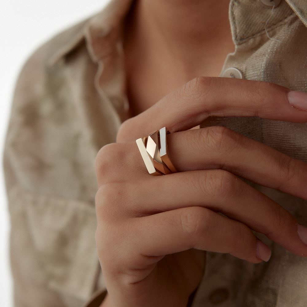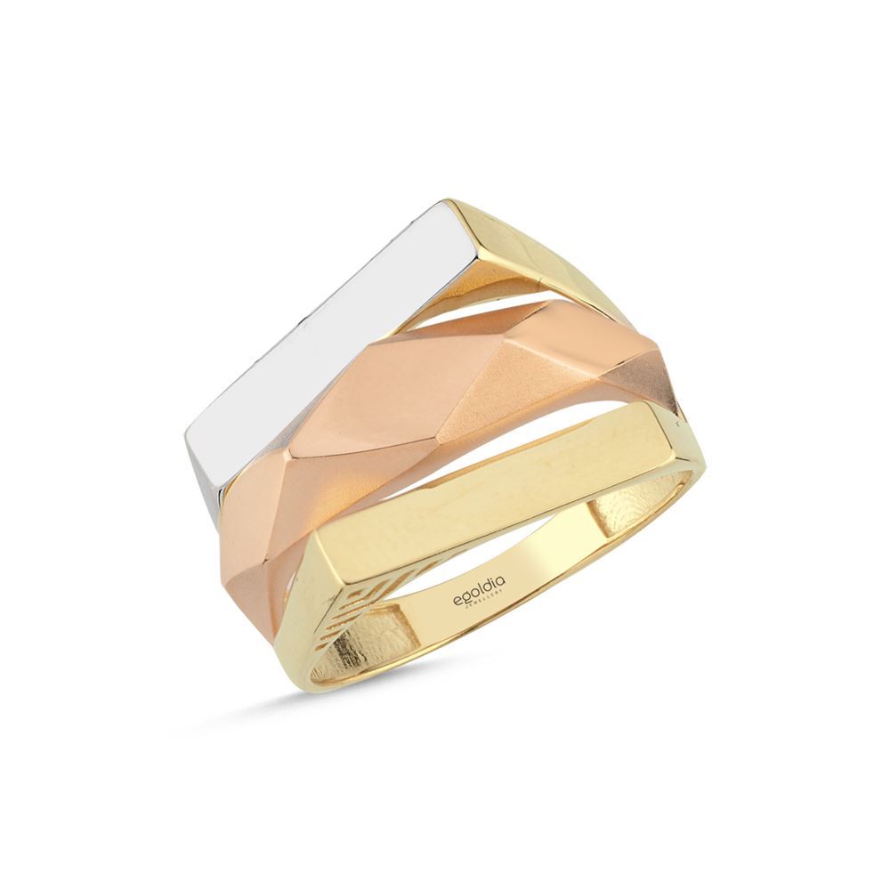 Üç renk yatay geometrik tasarım yüzük, farklı ve özgün yapısıyla E-Goldia Jewellery farkıyla sunuluyor.