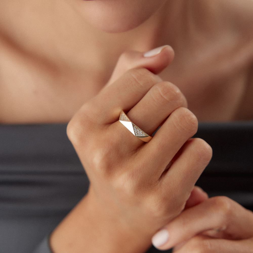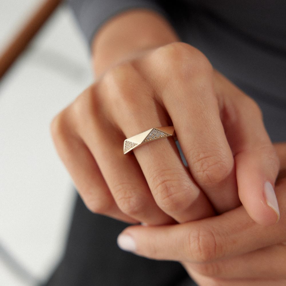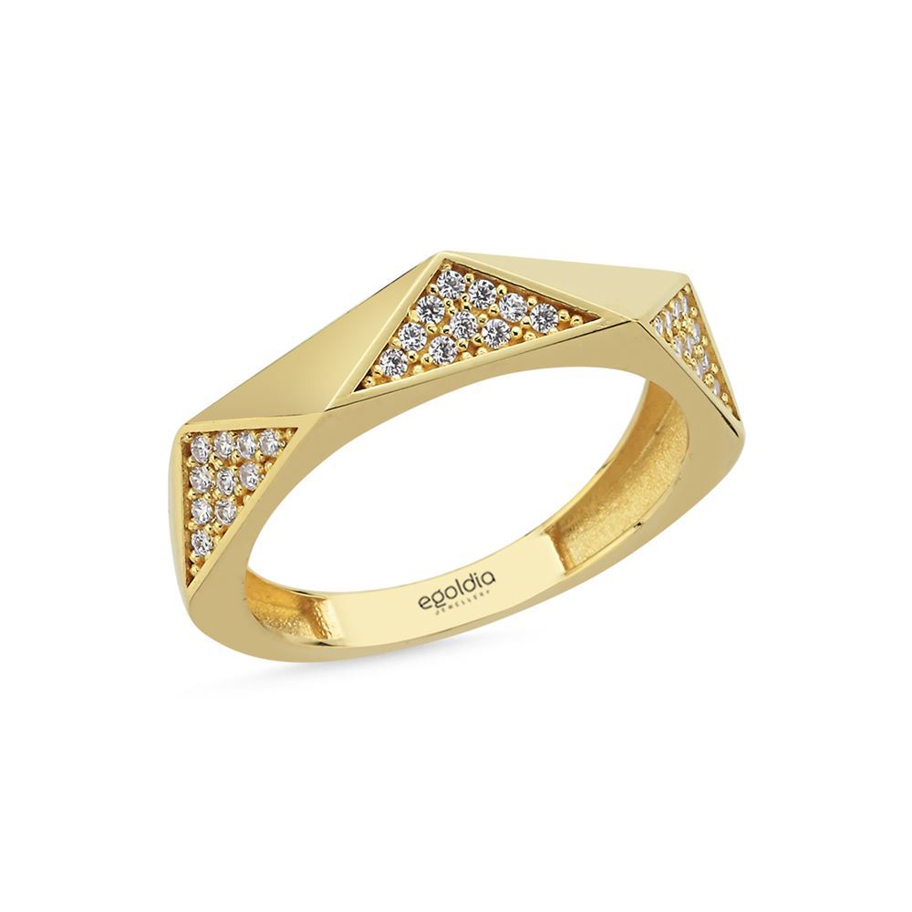 Üçgen taşlı yüzük, modern tasarımı ve şık taş detayları ile her parmağınızı süsler. Geometrik tasarımların zarif yorumu.