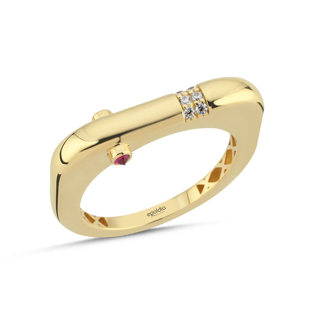 Yatay Tasarım Pembe Taşlı Yüzük, pembe taşların zarif ışıltısı ve yatay çizgilerin sadeliğiyle 14 ayar altından üretilmiştir. Kendinizi ya da sevdiklerinizi özel hissettirecek, anlam yüklü bir takı seçeneğidir.