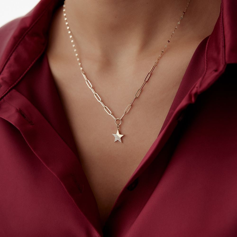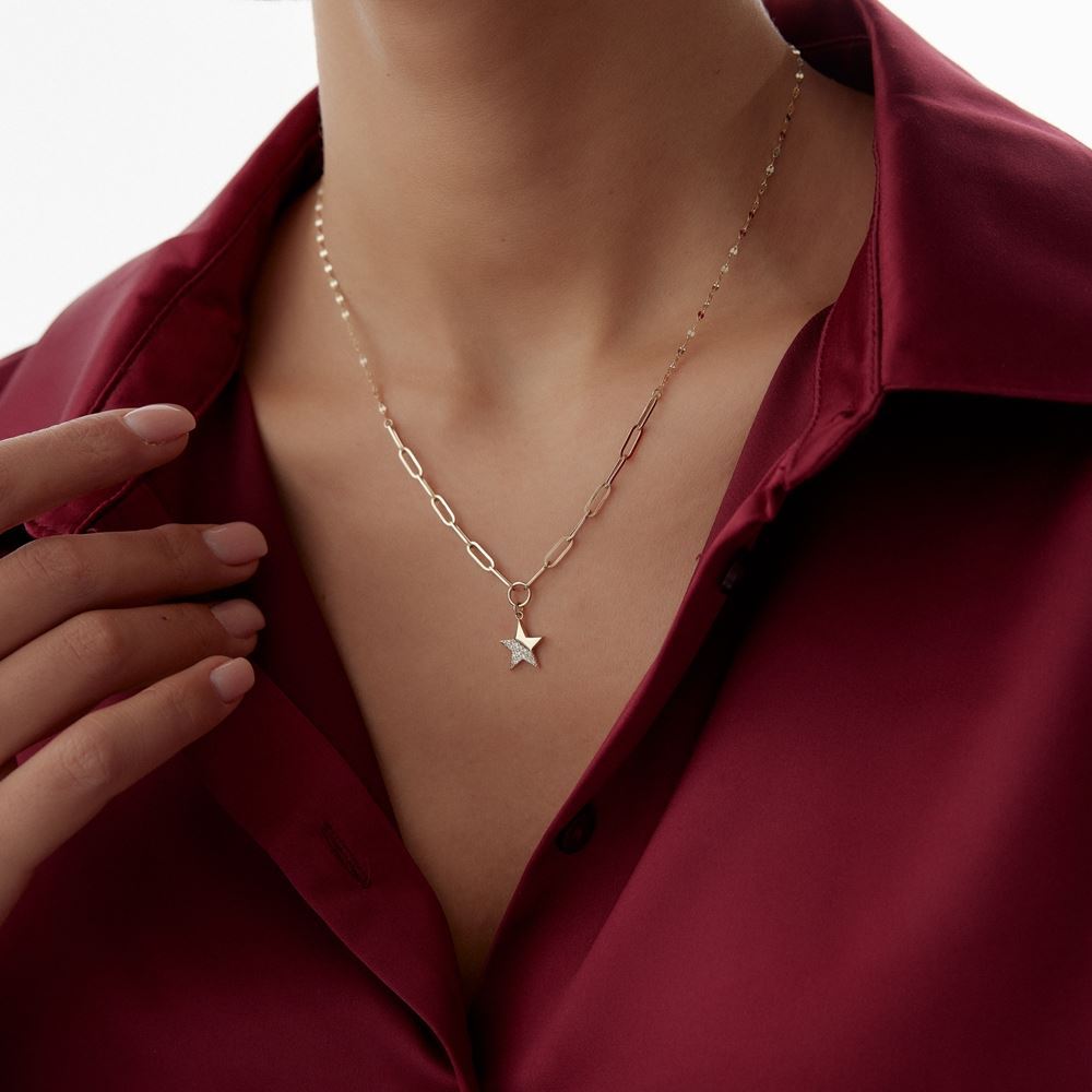 Yıldız ataç pullu taşlı kolye, modern ve sofistike tasarımıyla E-Goldia Jewellery koleksiyonlarının gözdesi.