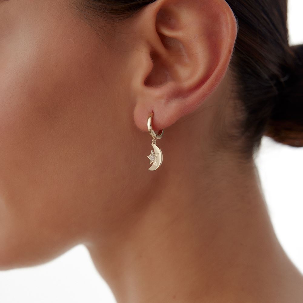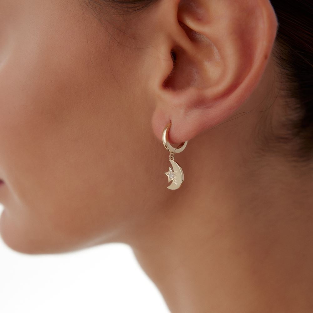 Yıldız ay taşlı tasarım küpe, gece gökyüzünün büyüsünü stilinize taşıyor. E-Goldia Jewellery koleksiyonlarında.
