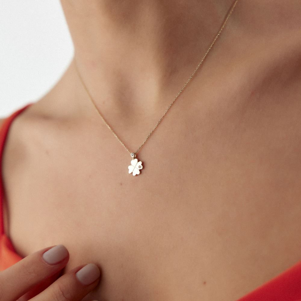 Zarif tasarımı ve yonca detaylı aynalı yüzeyiyle şıklığı tamamlayan bu kolye, her kombininize eşsiz bir dokunuş katar.