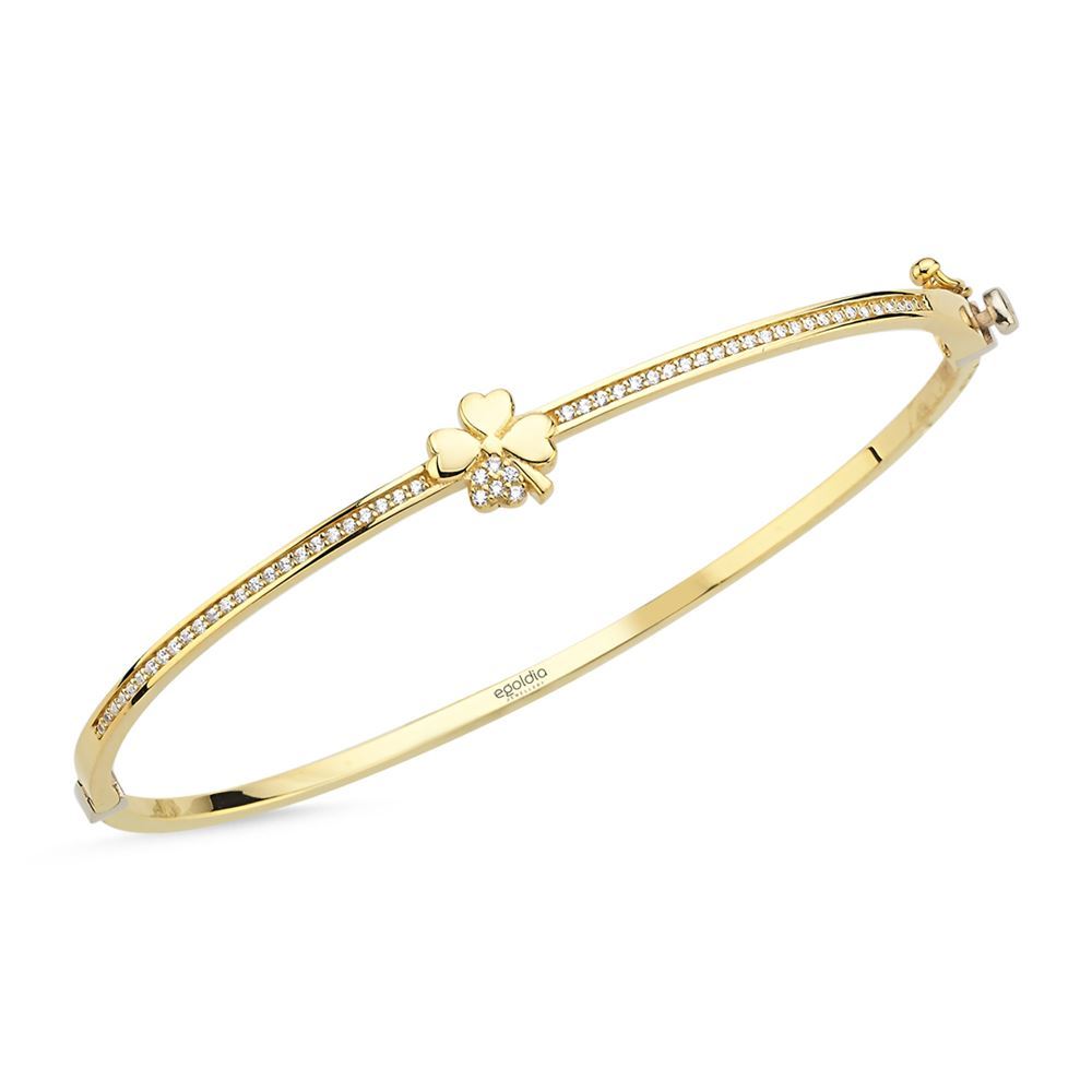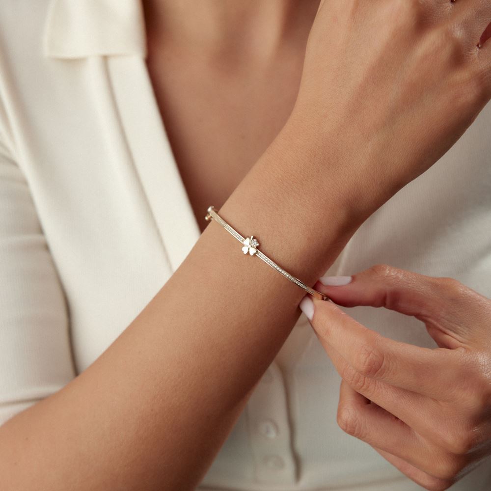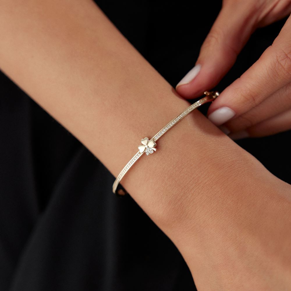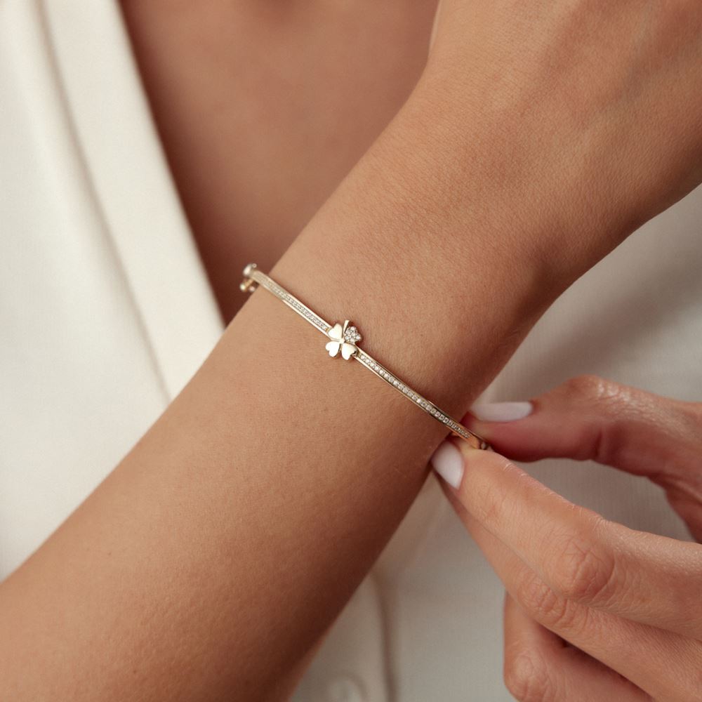 Yonca ve kalp detaylarının zarif birleşimiyle bu kelepçe, romantik bir dokunuş sunar.